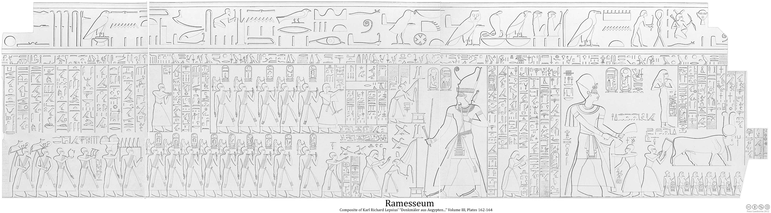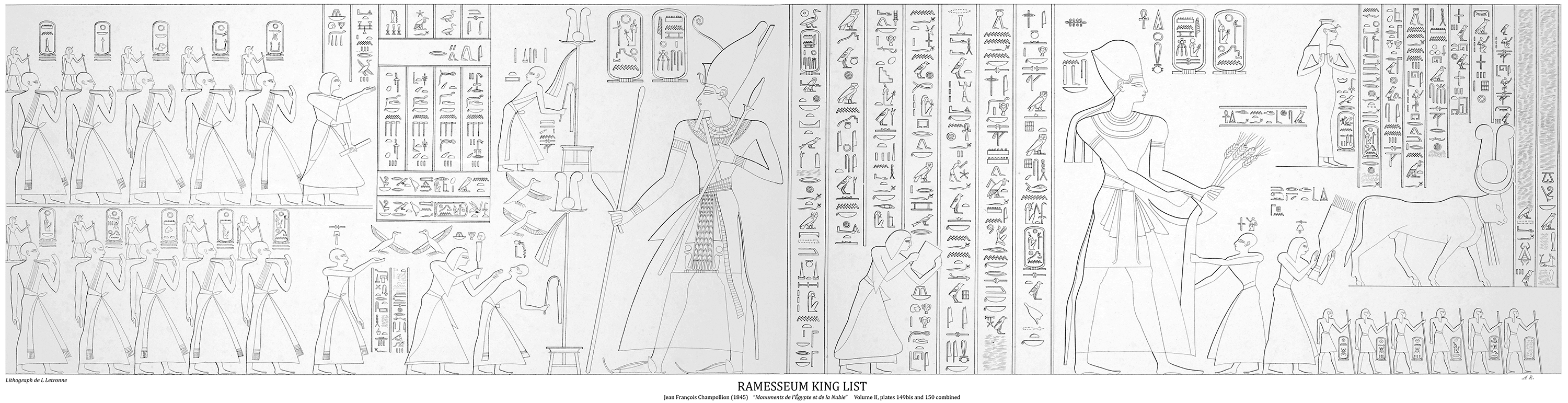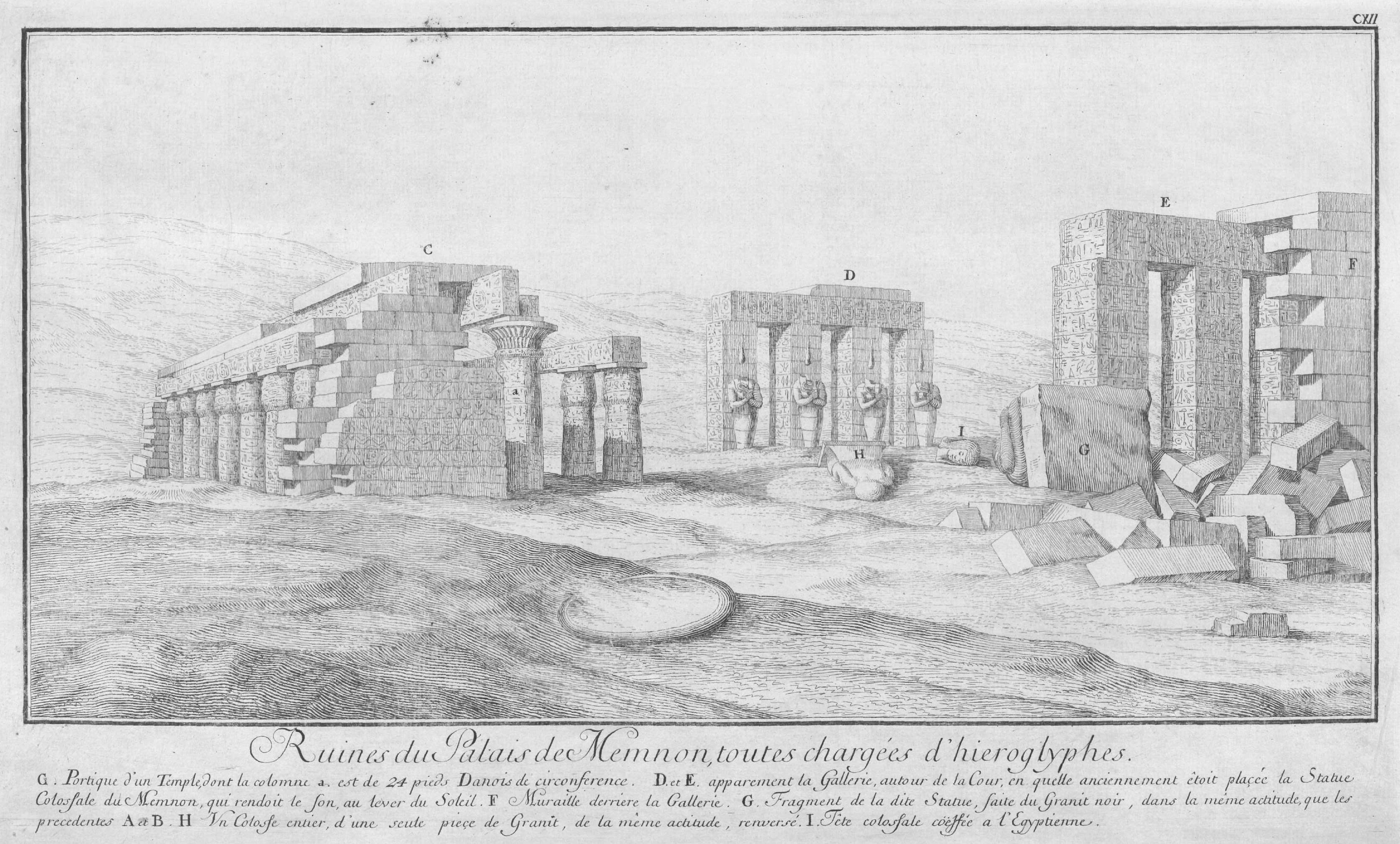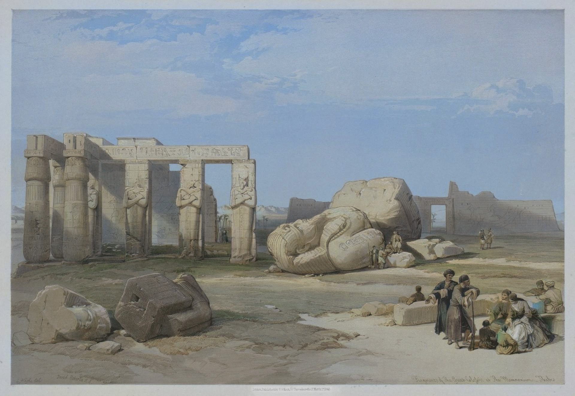 When rediscovered, it was eventually confirmed to be the vast monument of Ozymandyas described in antiquity by Diodorus and Strabo, who called it Memnonium. The name Ramesseum was first coined by Champollion, who visited the ruins in 1829, but Memnonium continued to be used by travellers until the 1850’s. The scene was first published by Champollion, followed by Lepsius some years later.