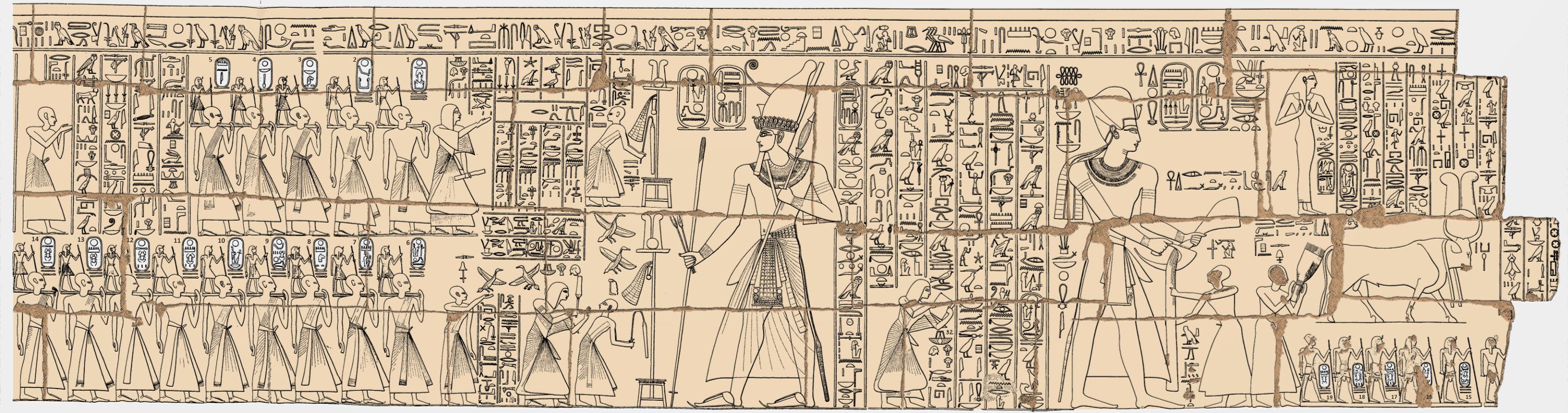 The ravages of time have not been kind to the Ramesseum, and only ruins of a small portion of the original structures survive today. Over the millennia its masonry was slowly being depleted and reused for other buildings, damaged by flooding, and finally neglected. Still surviving, the upper register of the second western pylon shows a processions where ancestors of Ramesses II are honored at ceremonies of the festival of Min. It contains two processions with ancestors being honored, containing 19 cartouches with the names of 14 pharaohs. Notably, Hatshepsut and the Amarna pharaohs are omitted.