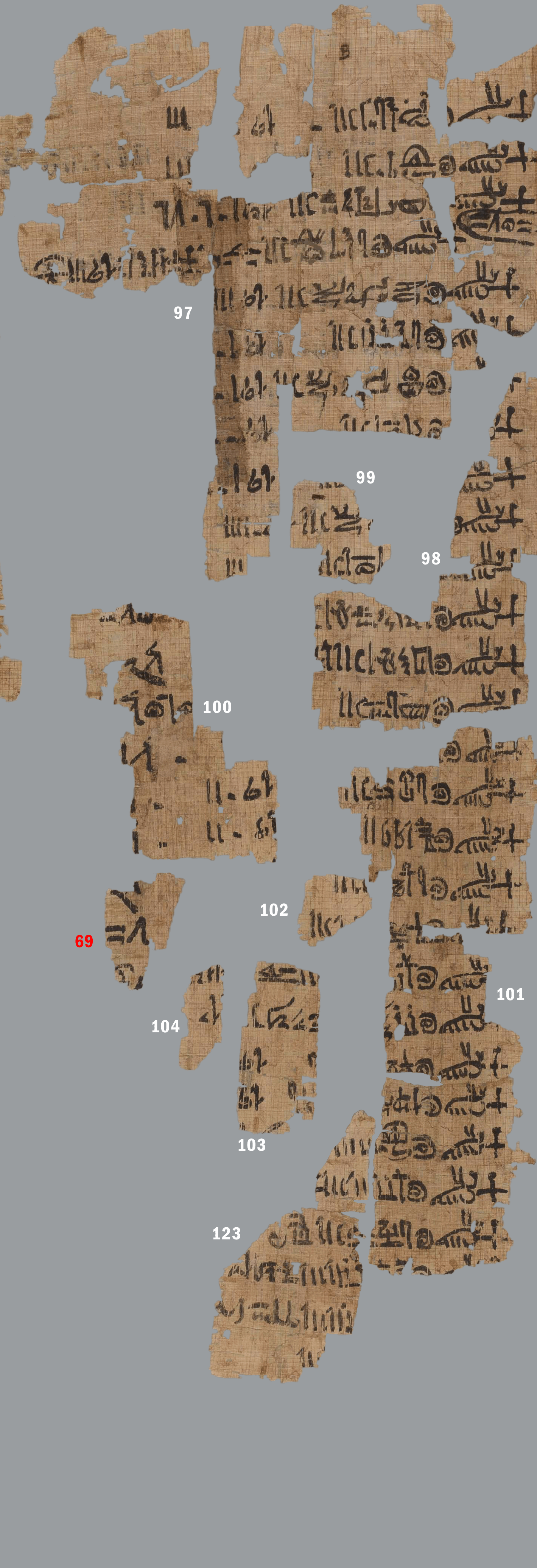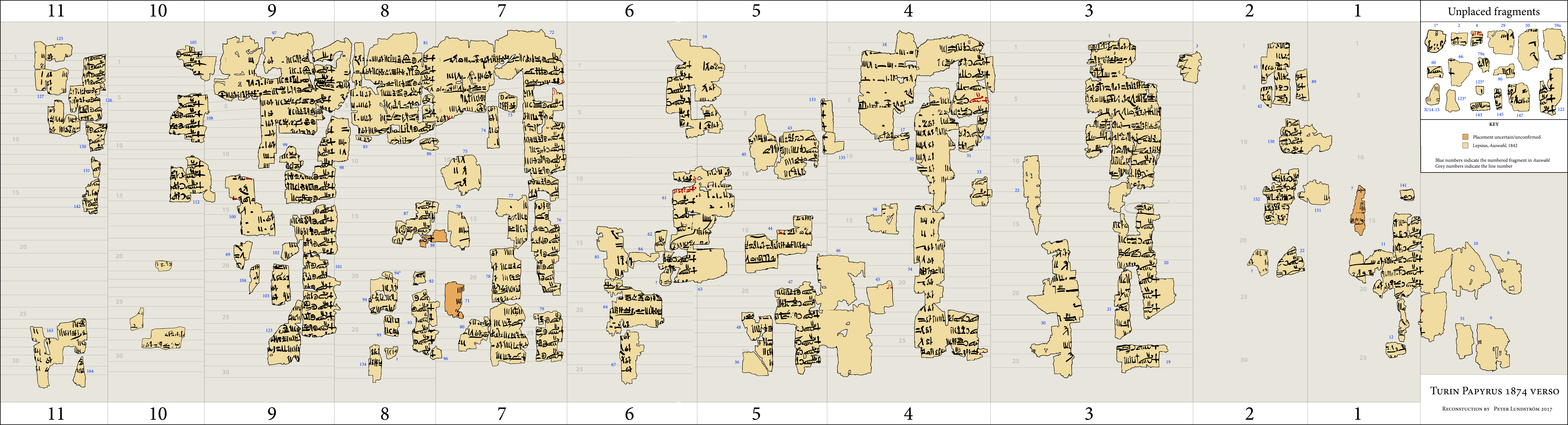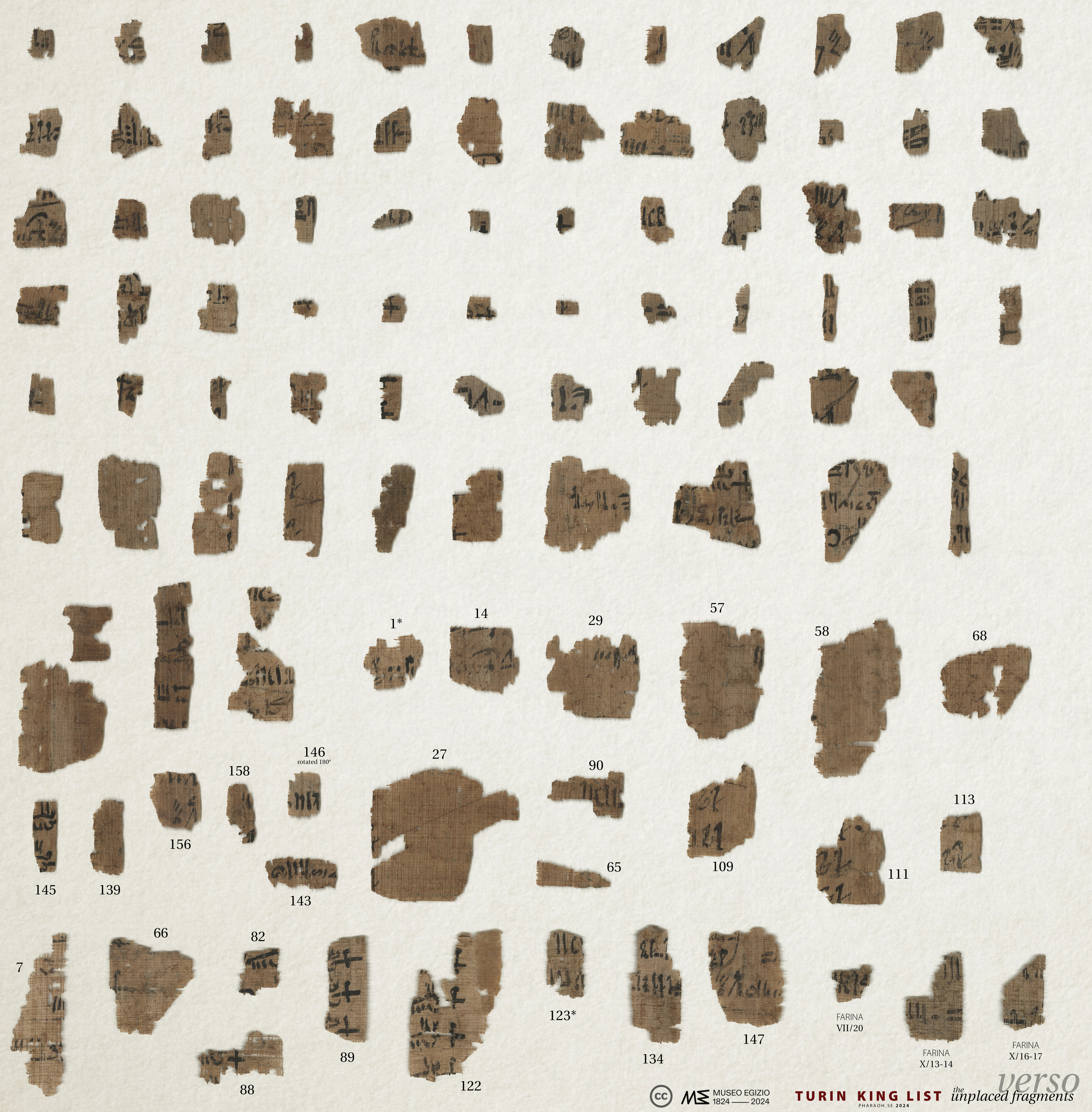 High Quality photos of the Turin King List were made available for free by the Musum in 2019. Very clear photos of the three panels are available on the Museo Egizio papyrus collection webpage (TPOP). Surprisingly, newer versions of the photographs are of lesser quality (Fall 2022) but include fragments not present in the first images. It should be noted that some of the fragments in these photos are in the positions fixed by Farina in the 1930s, and one fragment has even been rotated. The photos below are editied to align with the more current research. The 2022 restoration will be included when time permits.