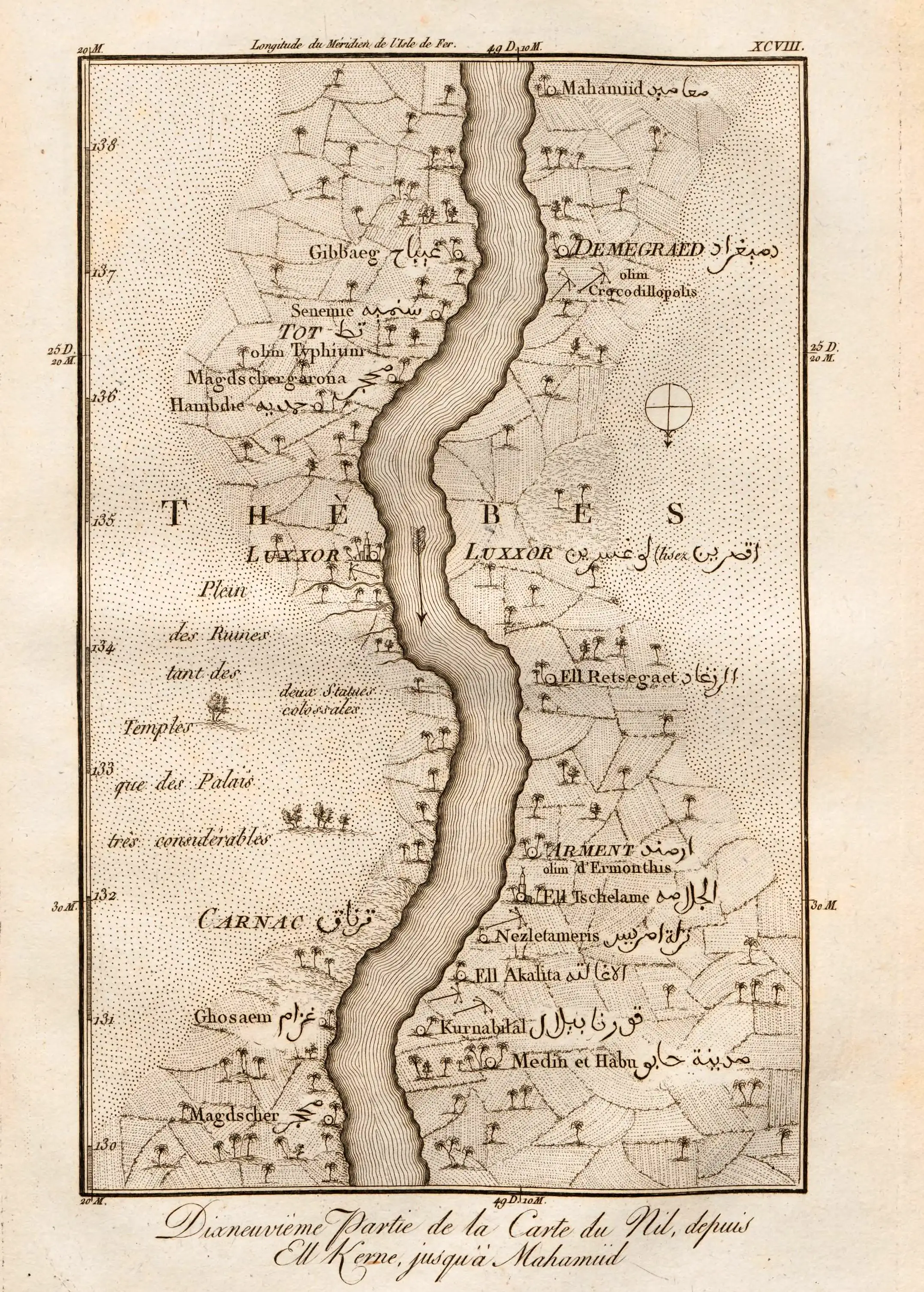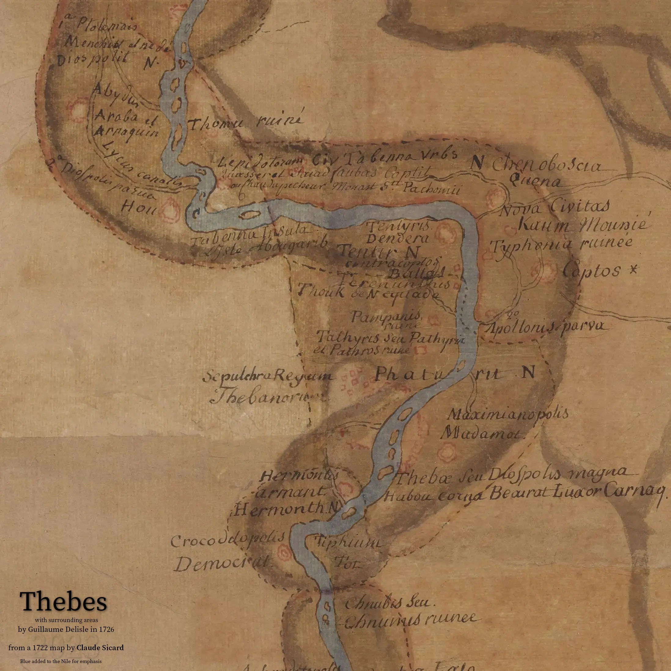 Even though it is obvious from Ptolemy’s map that Thebes is located deep south in Upper Egypt, the location was completely forgotten, other remains close to the delta being mistakenly referred to as Thebes. It was not until the Jesuit priest Claude Sicard (around 1710-20) noticed and marked the vast ruins around Karnak and Luxor as ancient Thebes.
