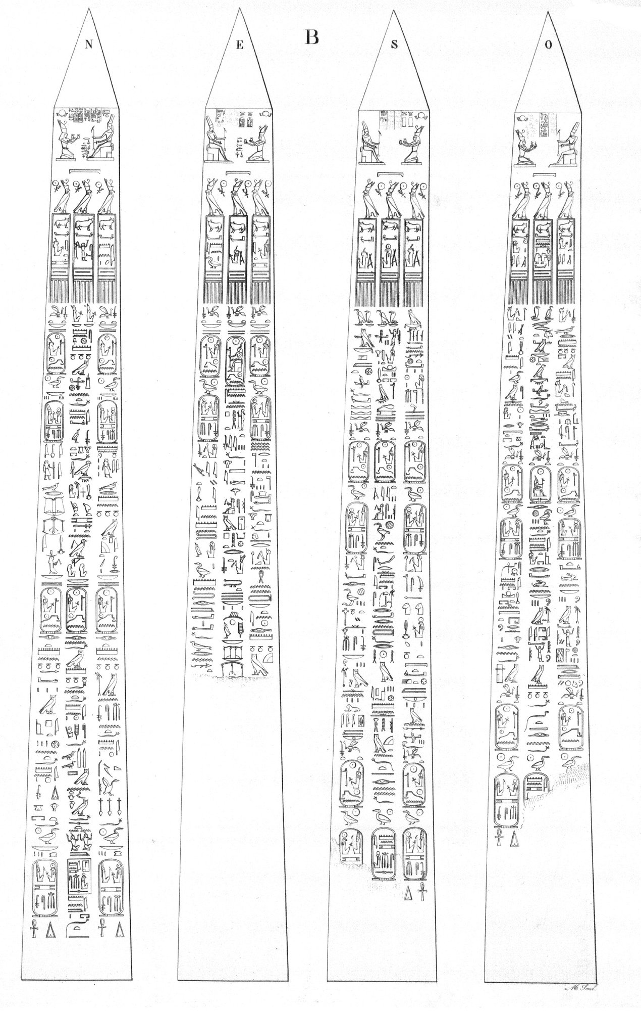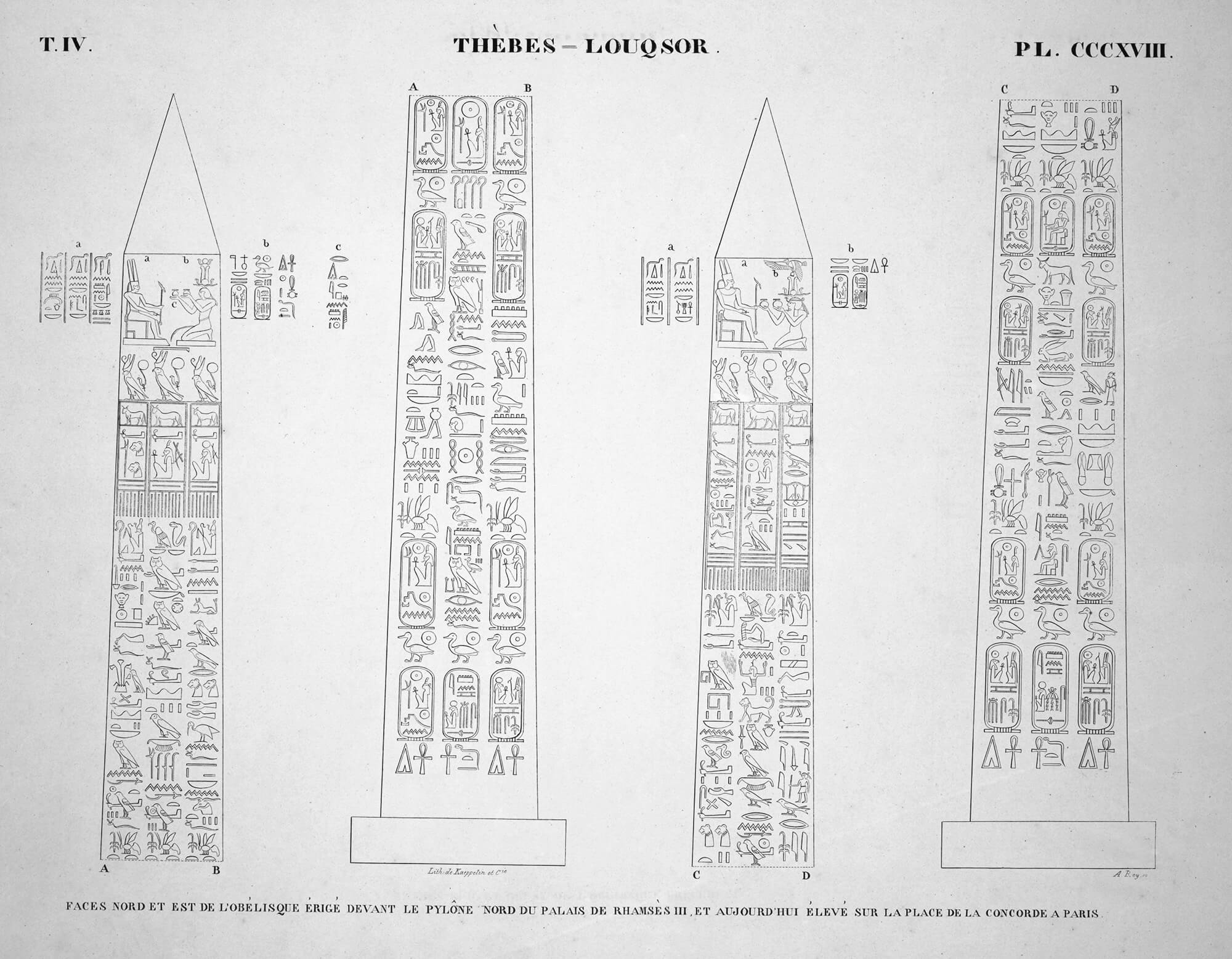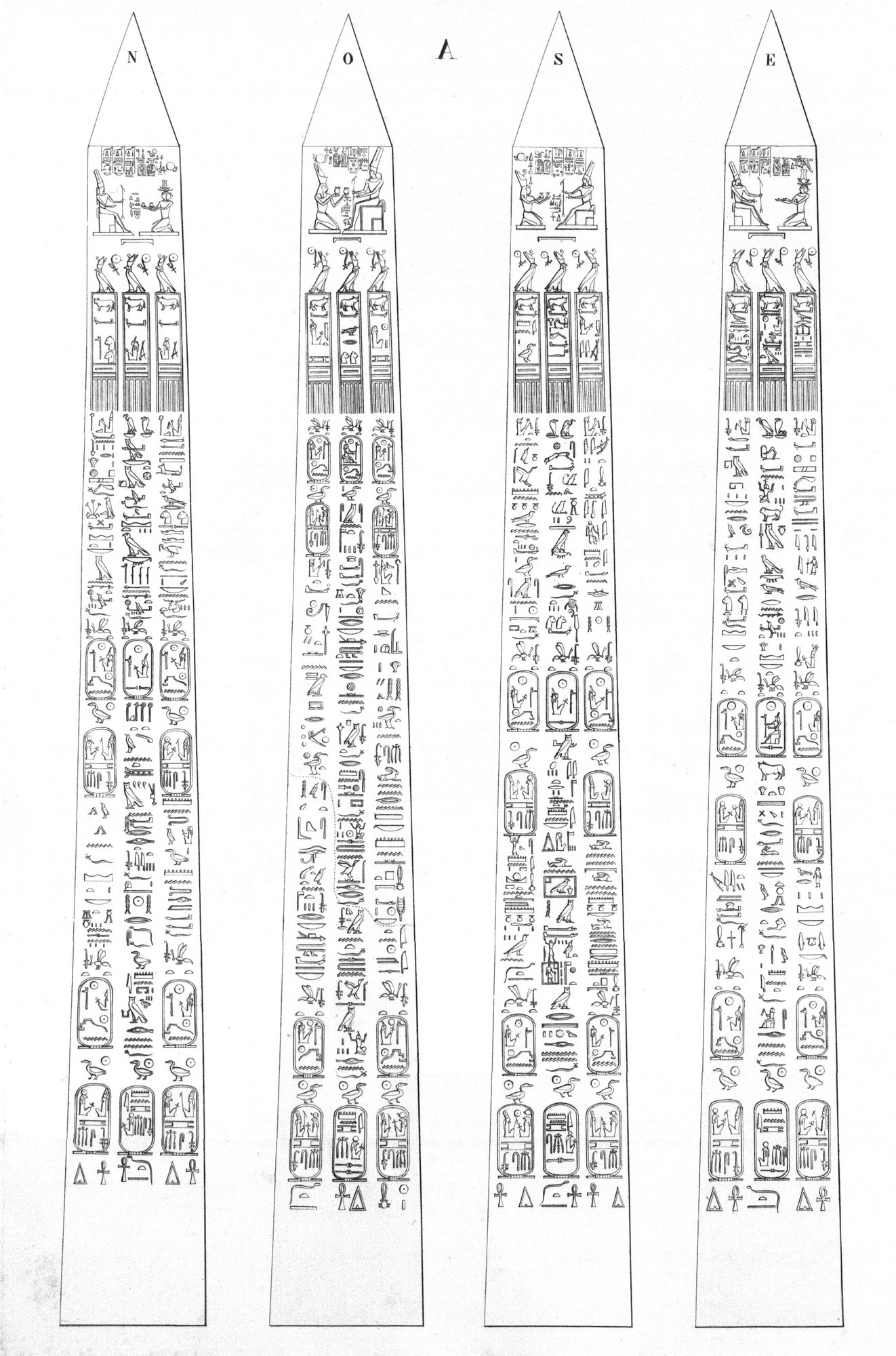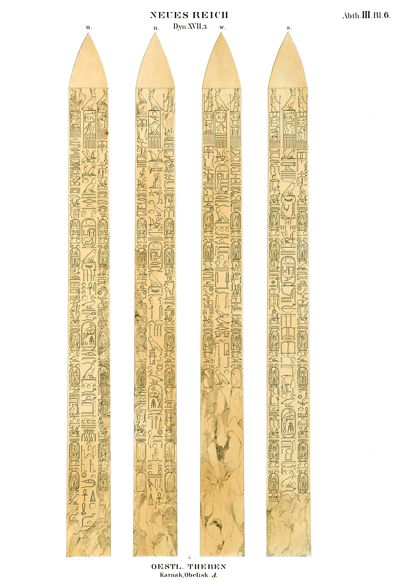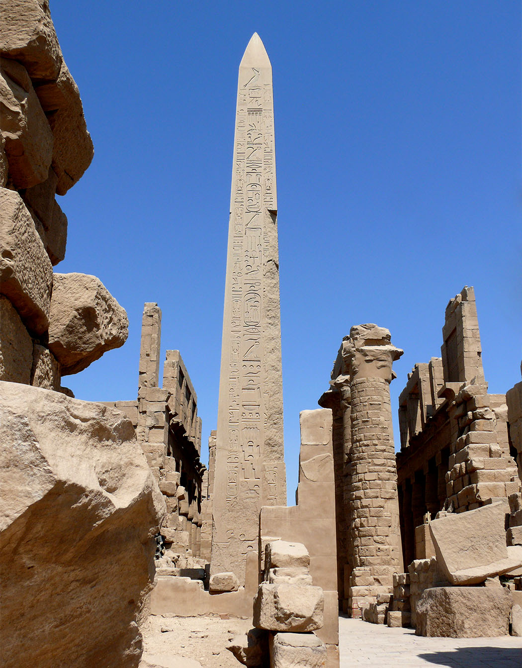 When renowned traveler Richard Pococke visited Karnak in the late 1730s, both obelisks of Thutmose I were still standing. However, the northern obelisk must have toppled before 1800 and today only the southern of the pair remain standing. It is leaning slightly. Originally created by Thutmose I, it was inscribed with a single column along all four sides of the obelisk. Three centuries later, Ramesses IV had columns added on both sides of the center columns. These added columns were in turn usurped by Ramesses VI only a few years later.