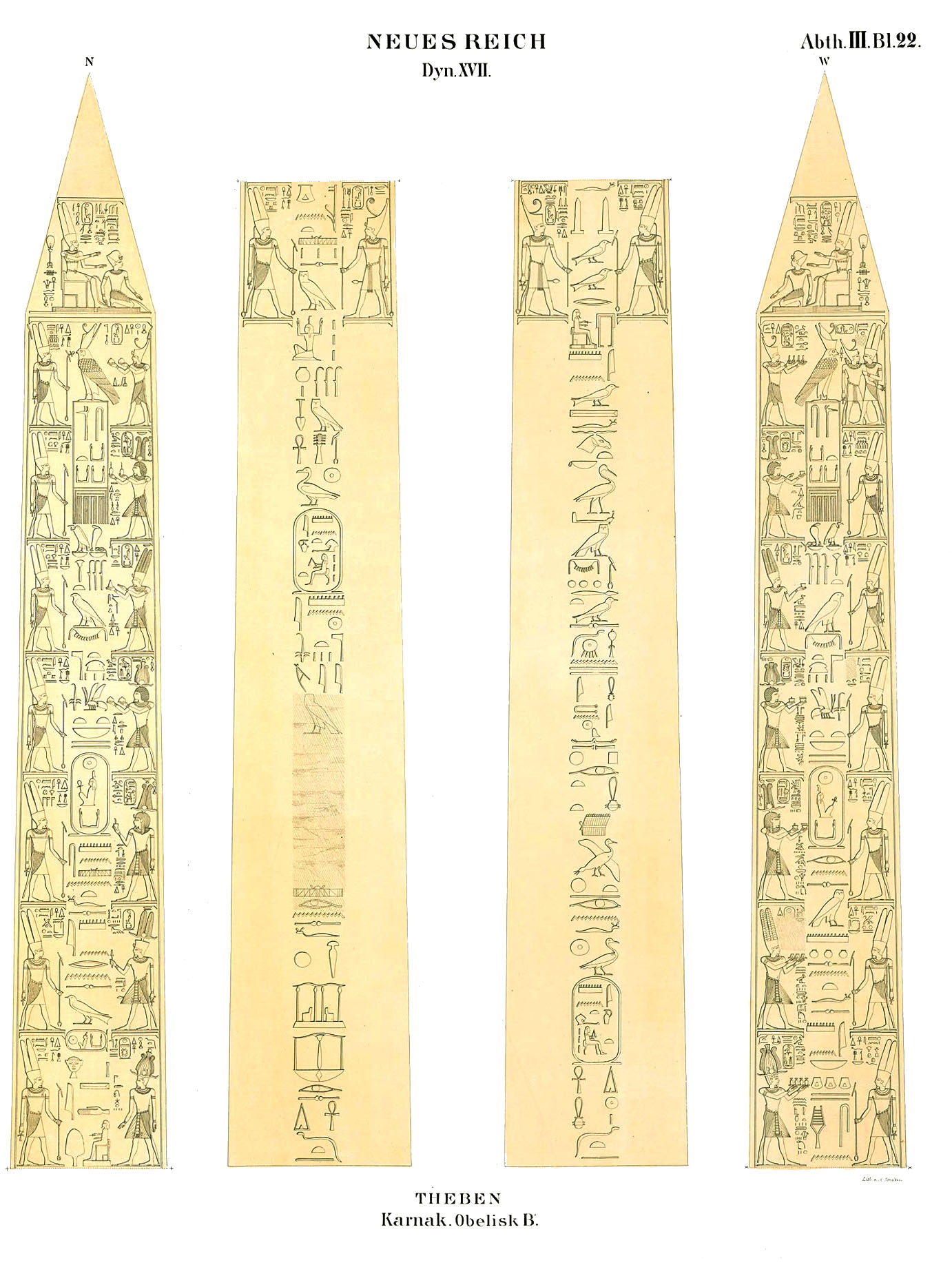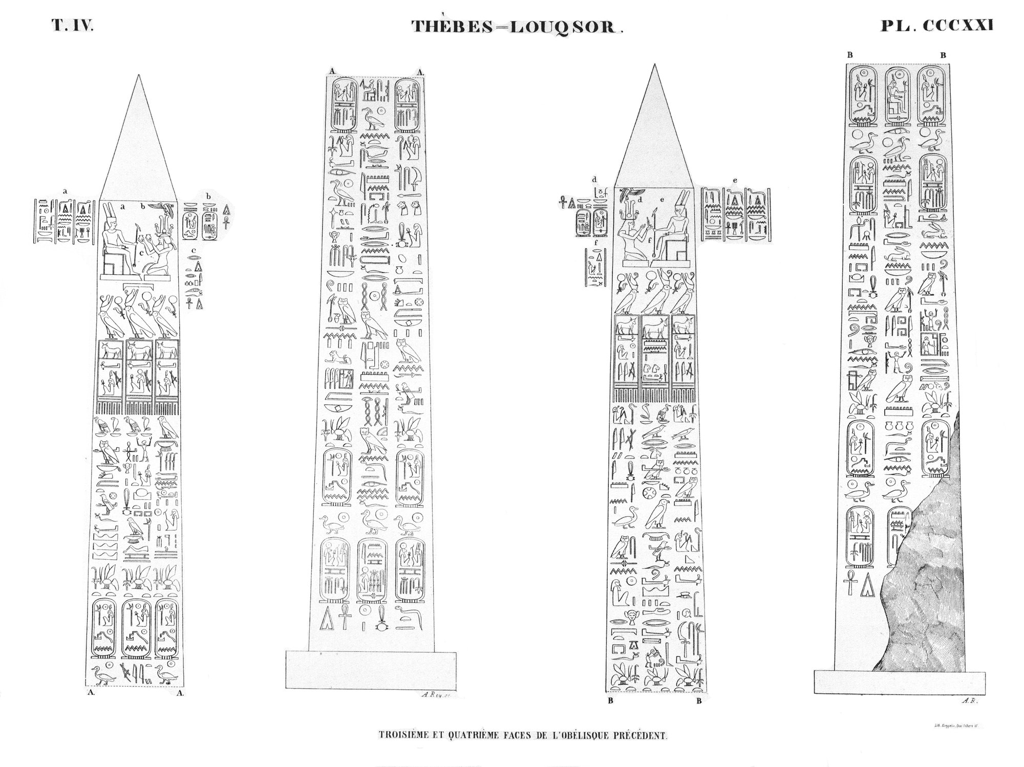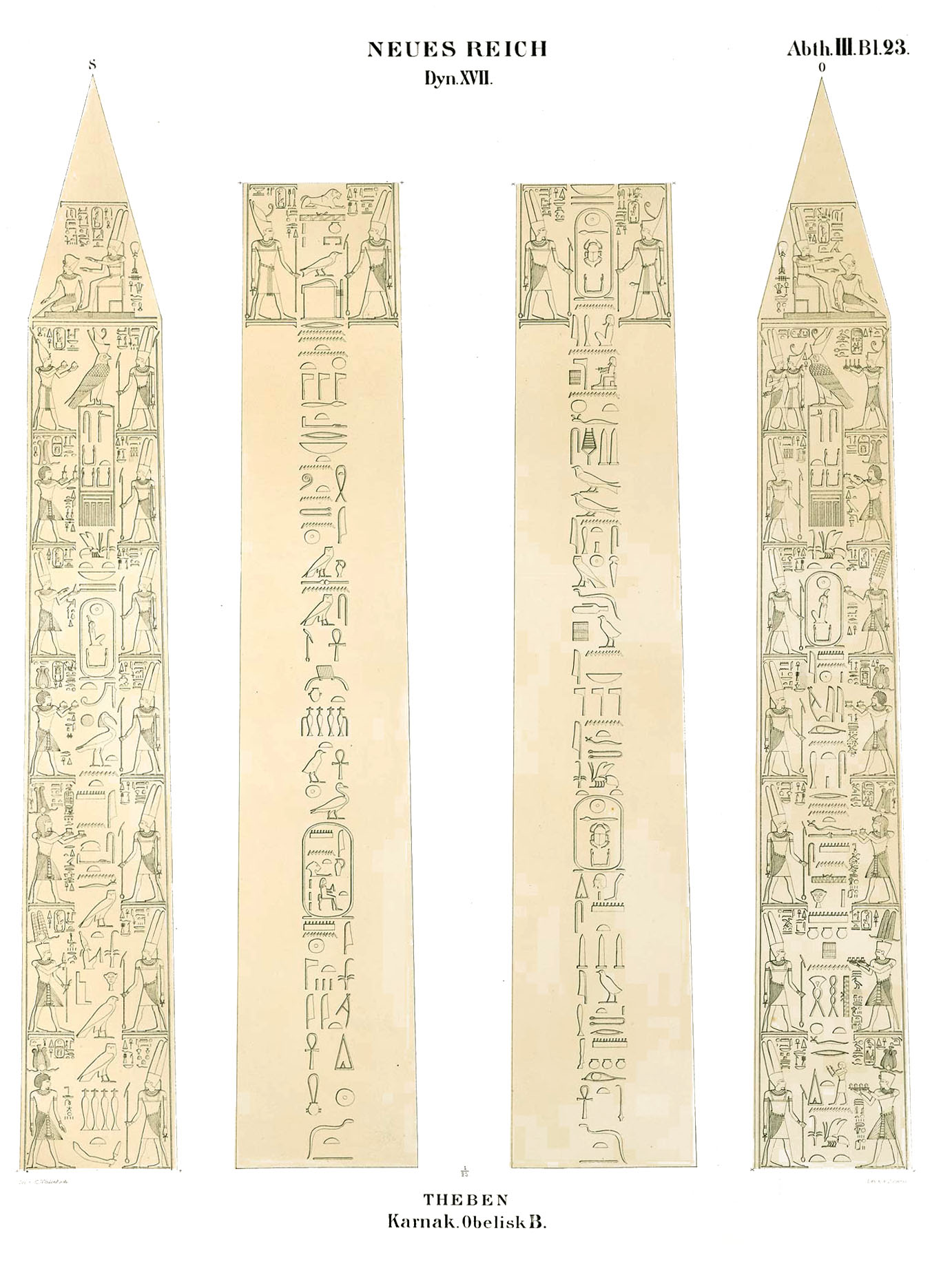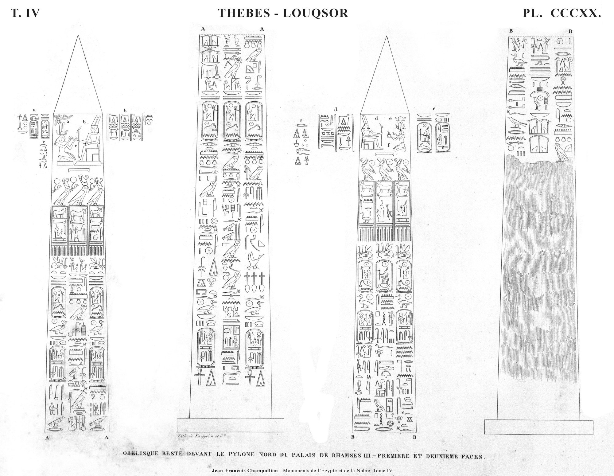 When renowned traveler Richard Pococke visited Karnak in the late 1730s, both obelisks of Thutmose I were still standing. However, the northern obelisk must have toppled before 1800 and today only the southern of the pair remain standing. It is leaning slightly. Originally created by Thutmose I, it was inscribed with a single column along all four sides of the obelisk. Three centuries later, Ramesses IV had columns added on both sides of the center columns. These added columns were in turn usurped by Ramesses VI only a few years later.