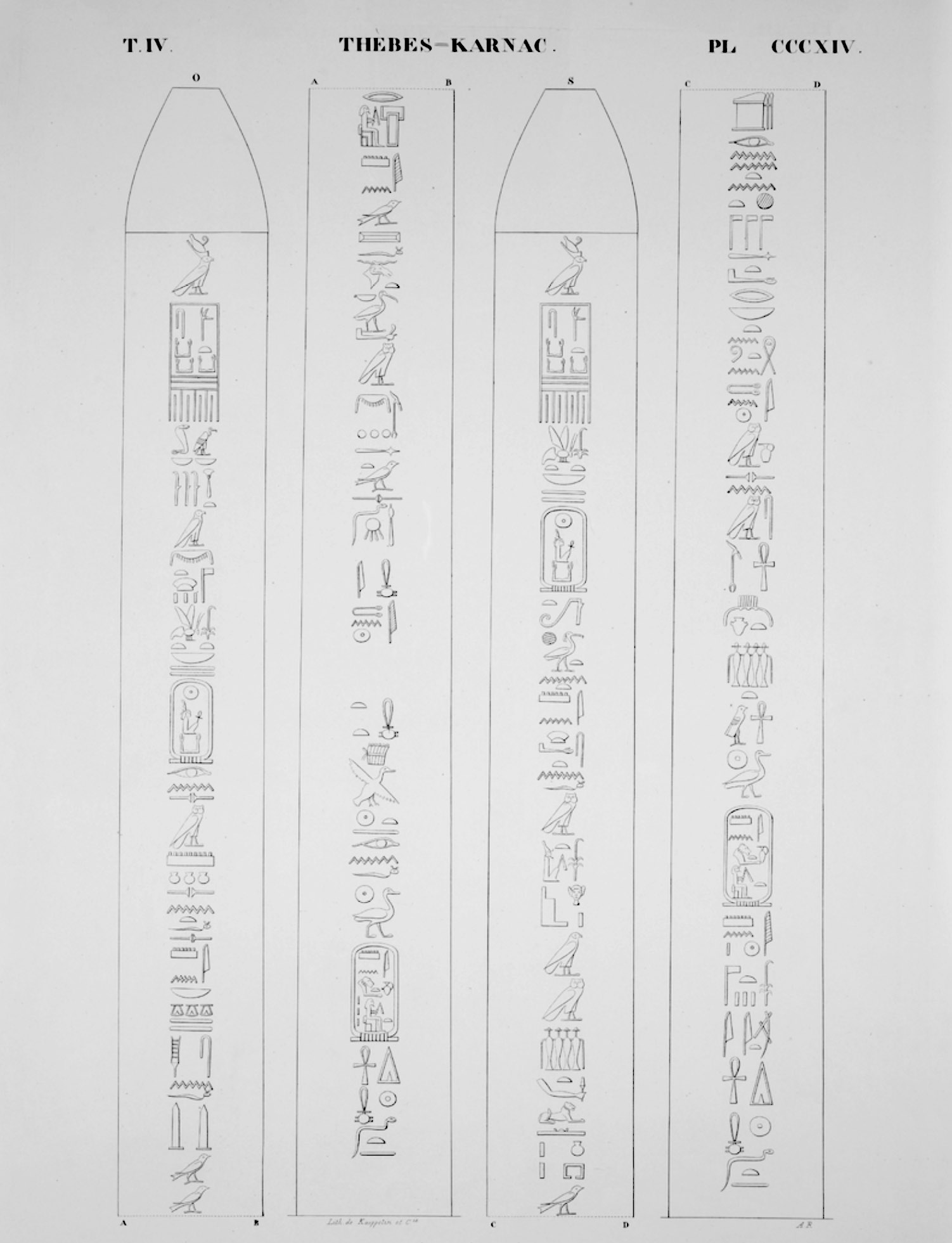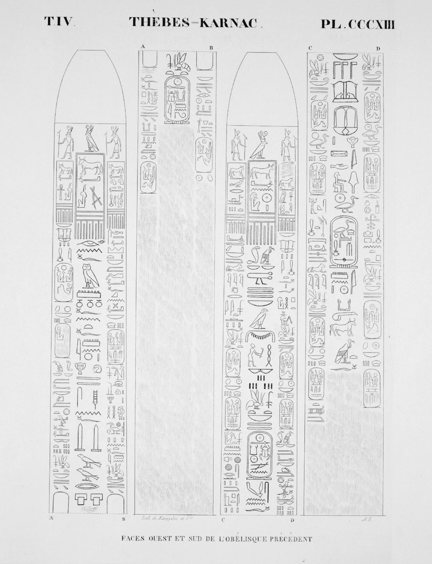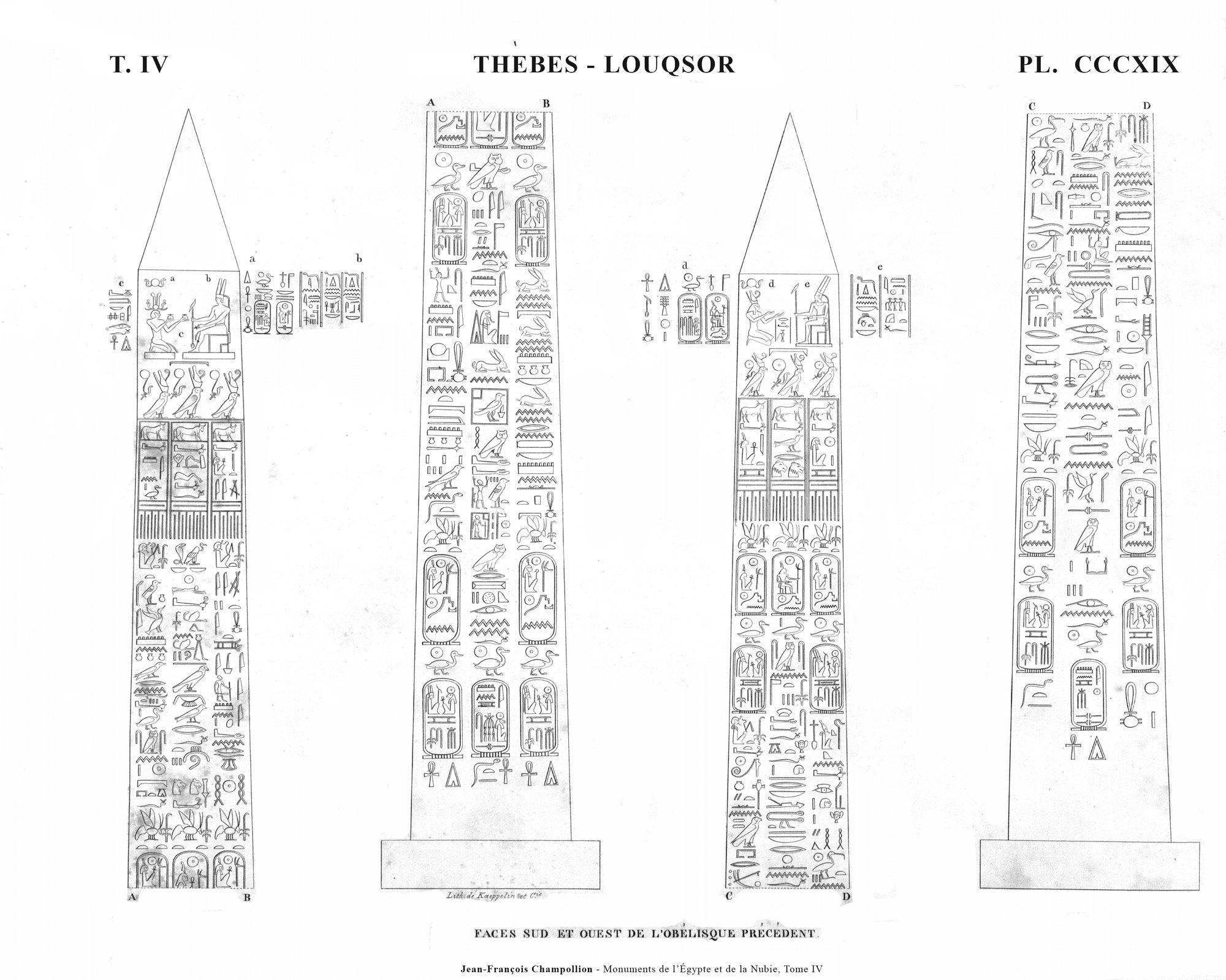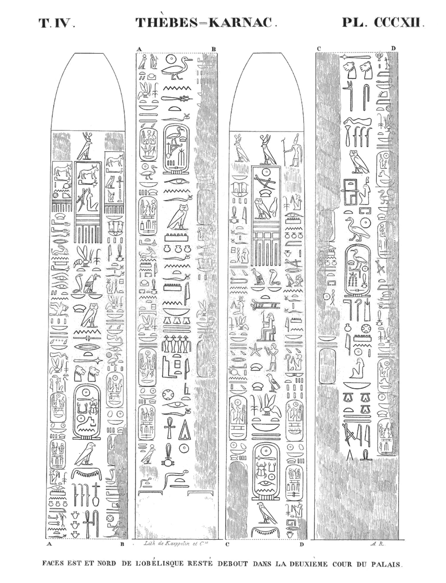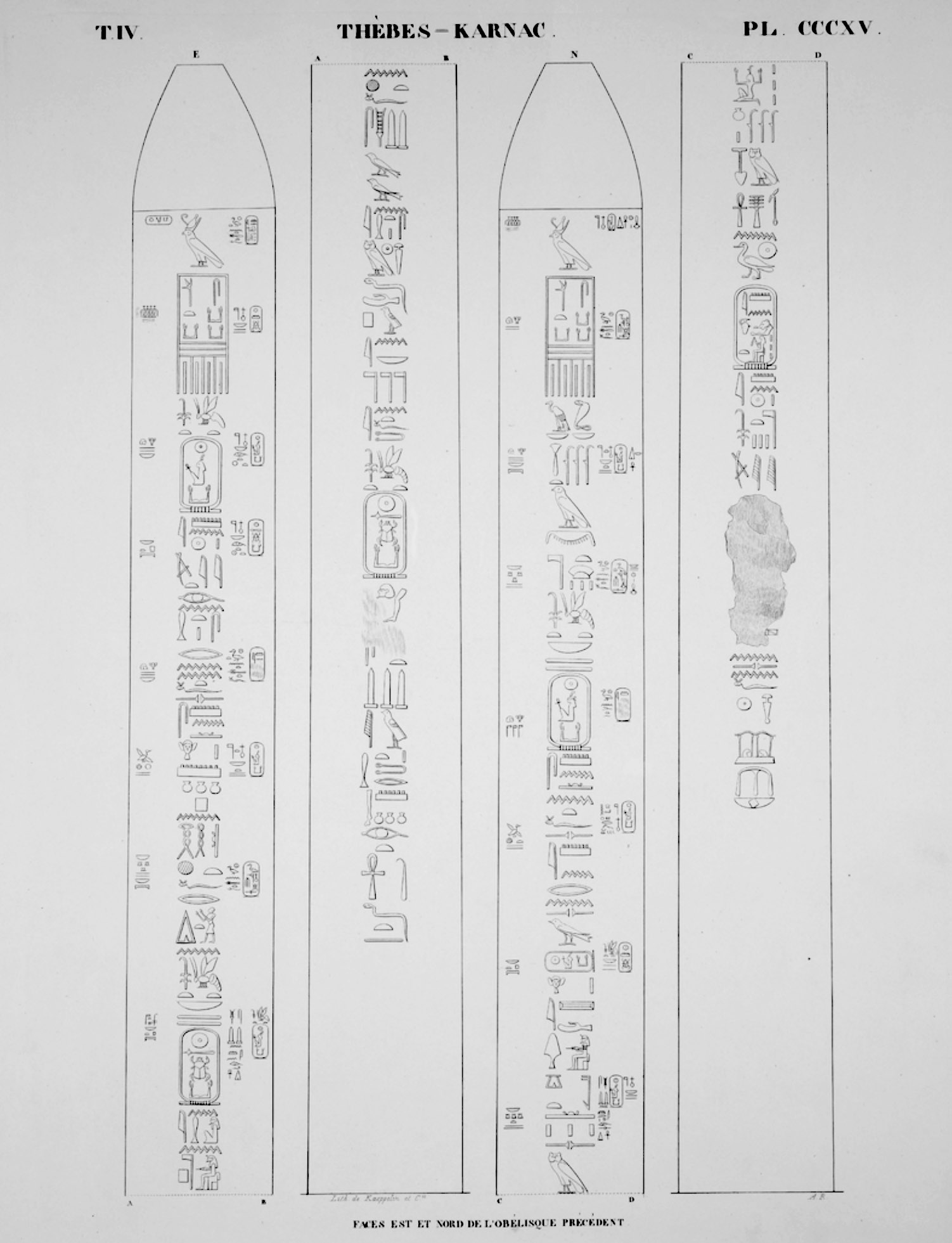 When renowned traveler Richard Pococke visited Karnak in the late 1730s, both obelisks of Thutmose I were still standing. However, the northern obelisk must have toppled before 1800 and today only the southern of the pair remain standing. It is leaning slightly. Originally created by Thutmose I, it was inscribed with a single column along all four sides of the obelisk. Three centuries later, Ramesses IV had columns added on both sides of the center columns. These added columns were in turn usurped by Ramesses VI only a few years later.