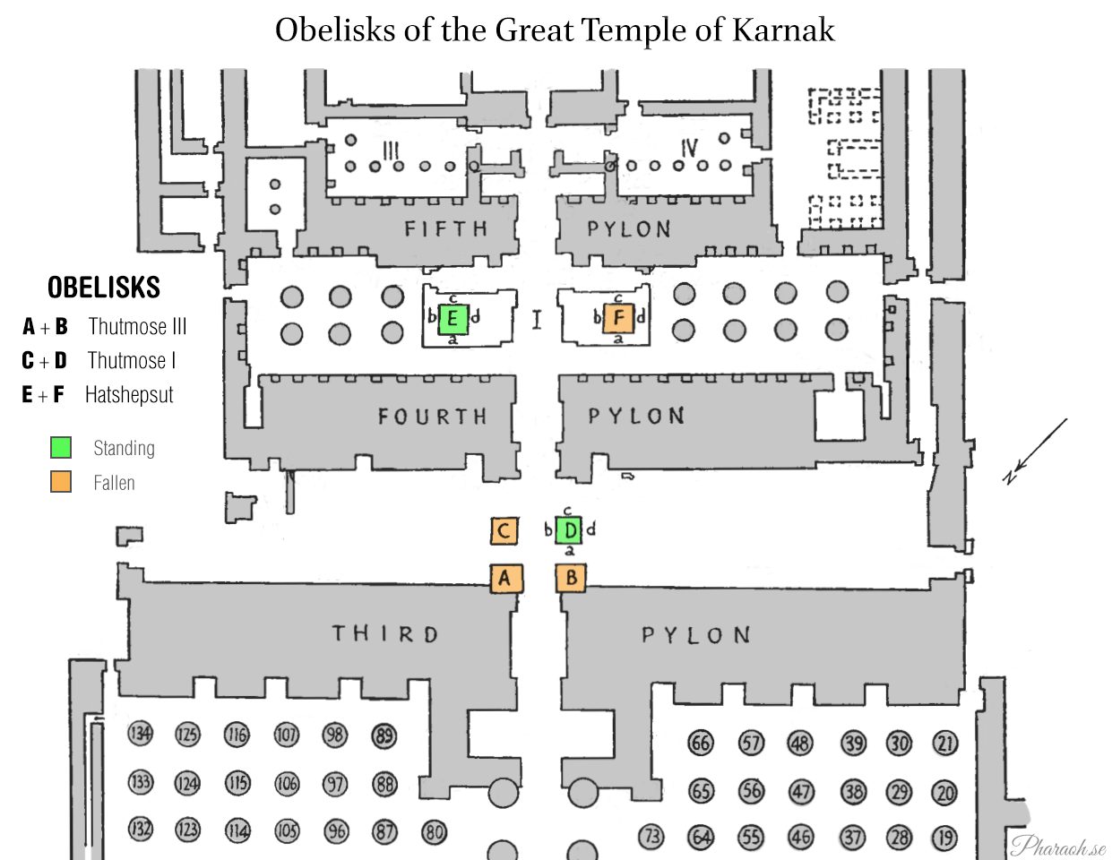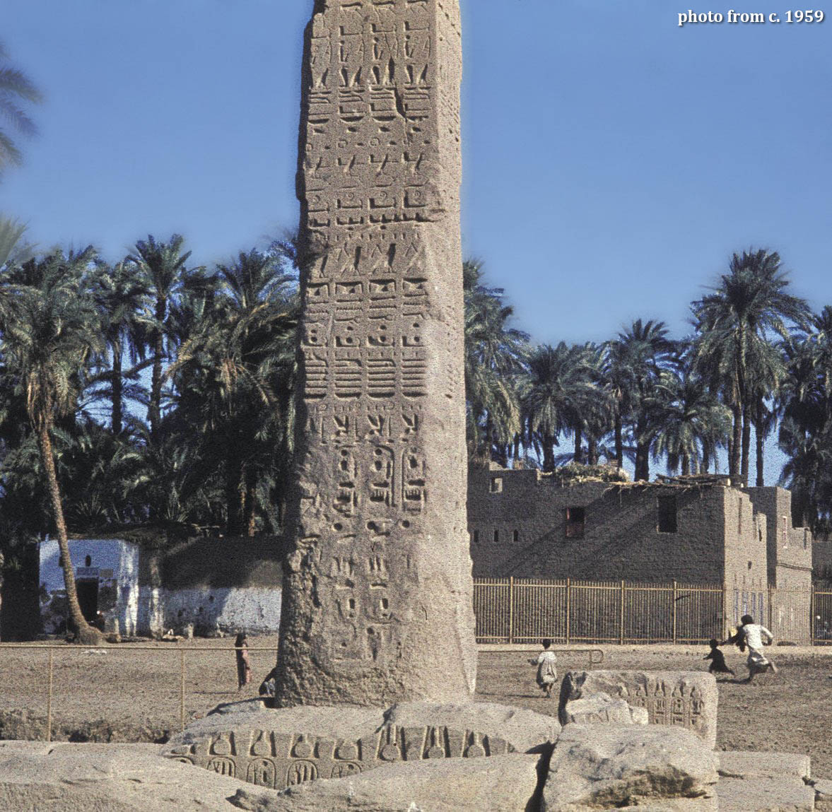 In 2022, the top part of the fallen Obelisk F (11 m., 36 ft tall) was re-erected next to the Sacred Lake at the side of the Great Temple, where it had lain on its side for decades. This is not the obelisk's original position, but at least it is in line with its twin.
