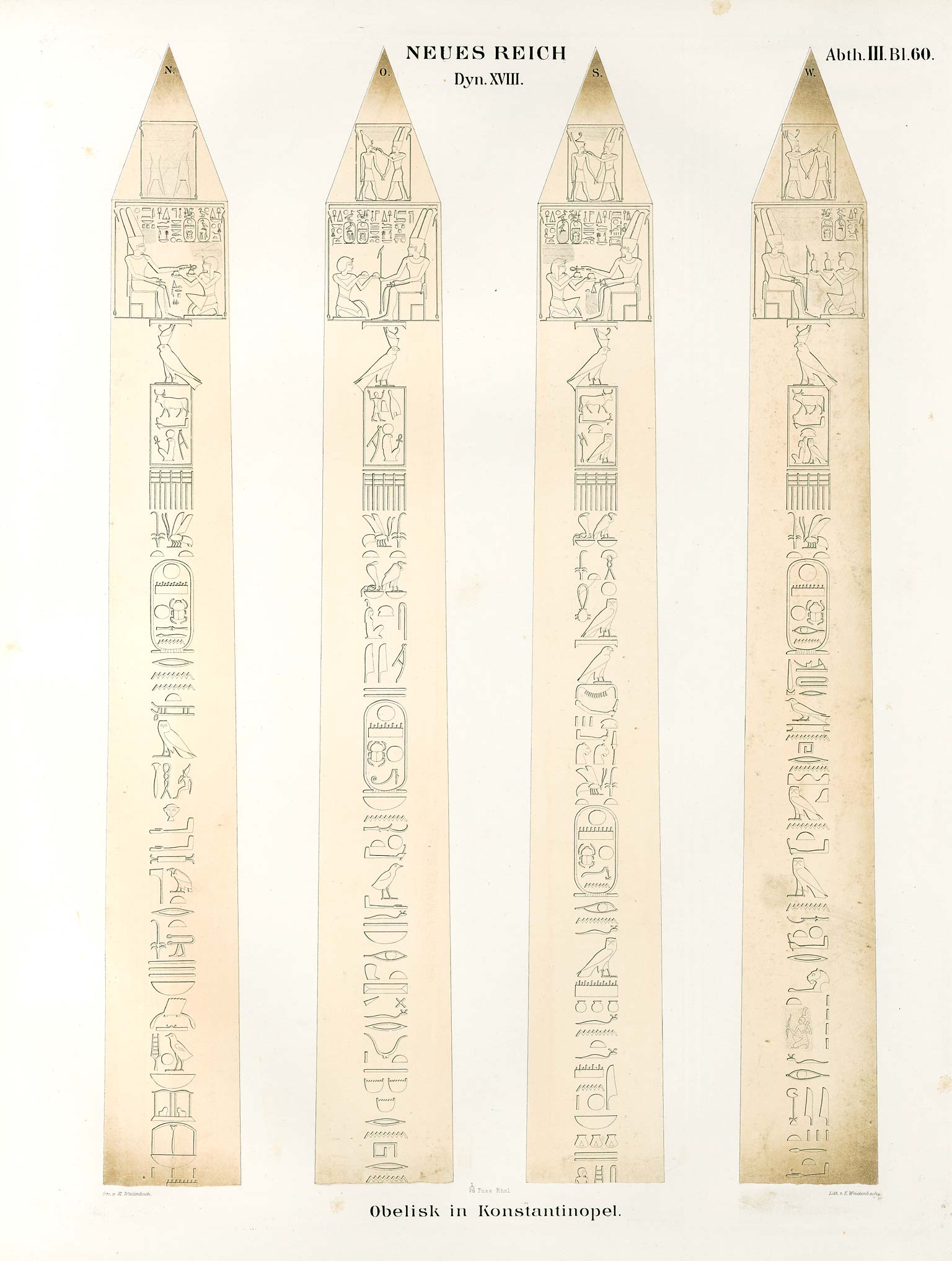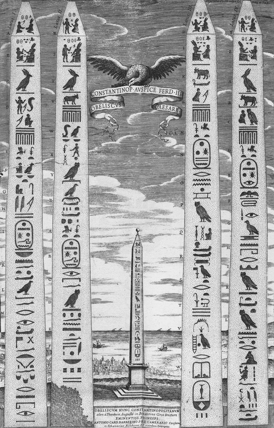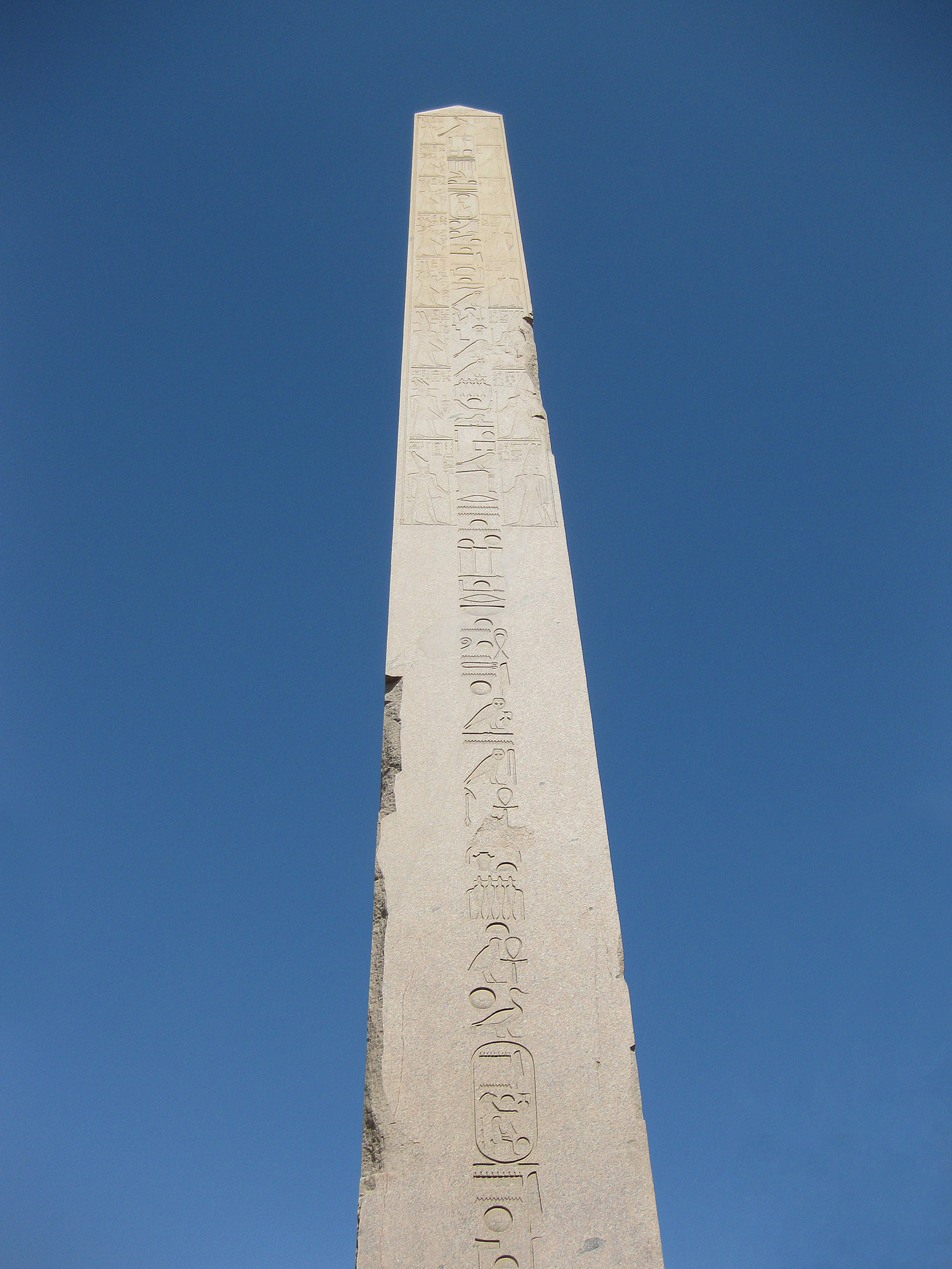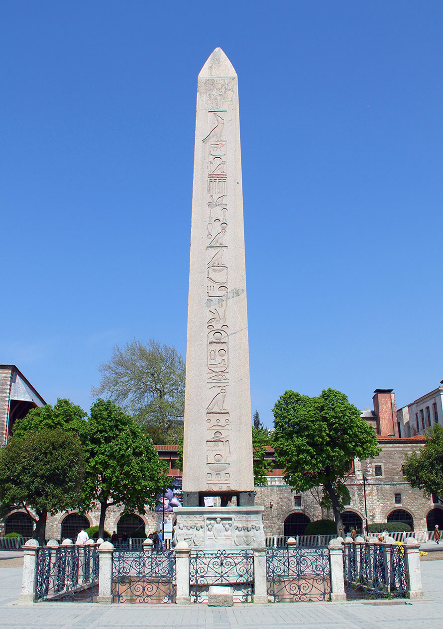A pair of obelisks were originally erected south of the Seventh pylon at Karnak celebrating the jubilee of Thutmose III. One of them was brought to Alexandria on orders of the Roman emperor Constantine in the 330s, with plans to bring it to his new capital of Constantinople. The twin was left in place at the temple, where fragments have been found. When Constantine died in 337, the transport was put on hold and the obelisk was abandoned ashore. Decades later, it is unknown exatly when, it was transported to Constantinople, where emperor Theodosius had a pedestal base with Latin and Greek inscriptions installed. The obelisk was originally about 29 meters tall, but has lost about a third of its lower end. The Latin text alludes to a failed attempt to erect the obelisk, which could account for the obelisk's bottom third being removed. This lower part (now lost) once stood in the Strategium forum complex, according to Byzantine sources, while the upper part was erected in the Hippodrome in 390.