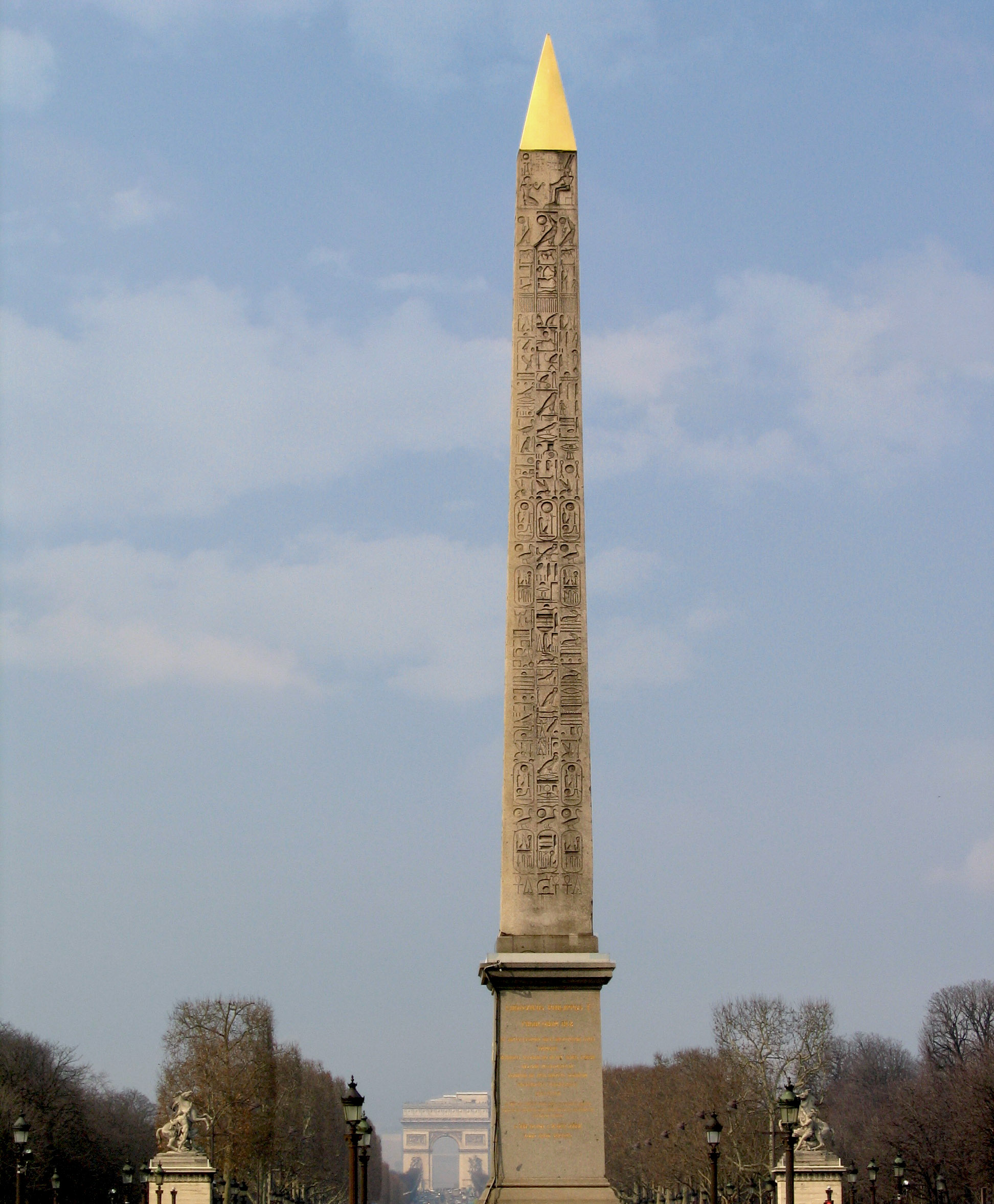Originally standing to the right (west) of the entrance pylon to Ramesses II's temple at Luxor. The obelisks were gifted to France in 1830 by the Egyptian government and transport to Paris began the following year. After a long and slow voyage to Paris, it arrived in 1833, and was erected on a large pedestal base in 1836 at the center of Place de la Concorde. The transport was extremely expensive for the time which is probably the reason that its twin still remain at Luxor. The gold-leafed pyramidion was added in 1998.