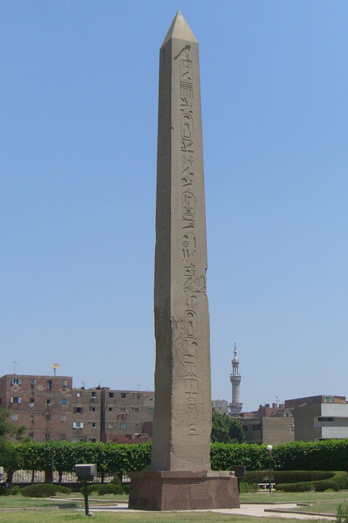 It's incredible that this obelisk, which was erected by Senusret I over 4000 years ago, is still standing in its original location in Heliopolis. The Romans plundered several obelisks from the site, and probably left the rest in ruins. Today, this obelisk is all that remains of Heliopolis, the medieval expansion of Cairo all but erased the last traces of the once great place. The obelisk was in danger of toppling in the early 1950s due to rising groundwater levels, but was stabilized. A further stabilizing structure was built in the mid-70s, raising the base by 2 meters.