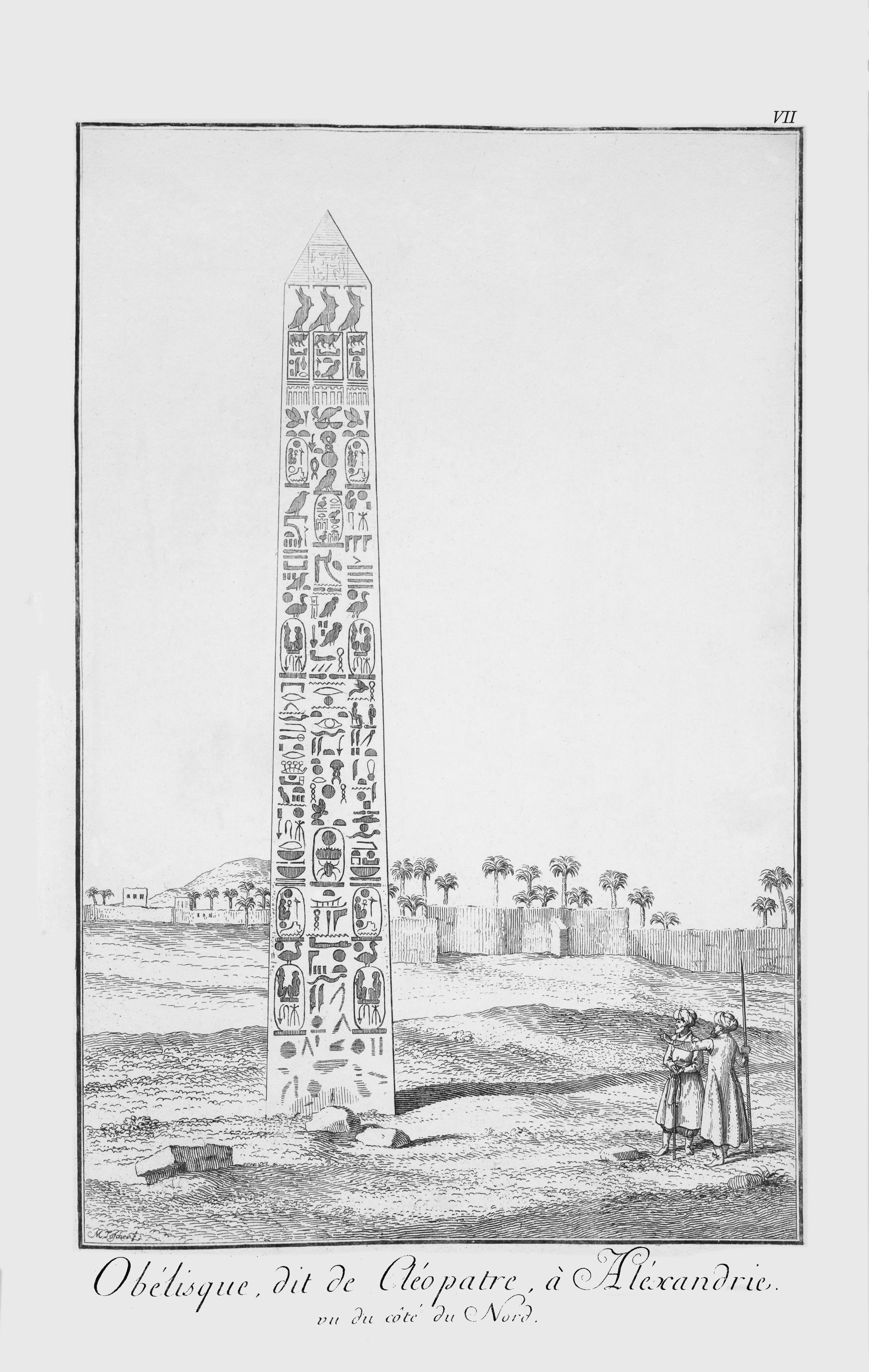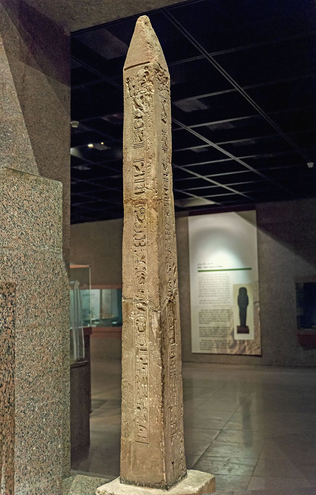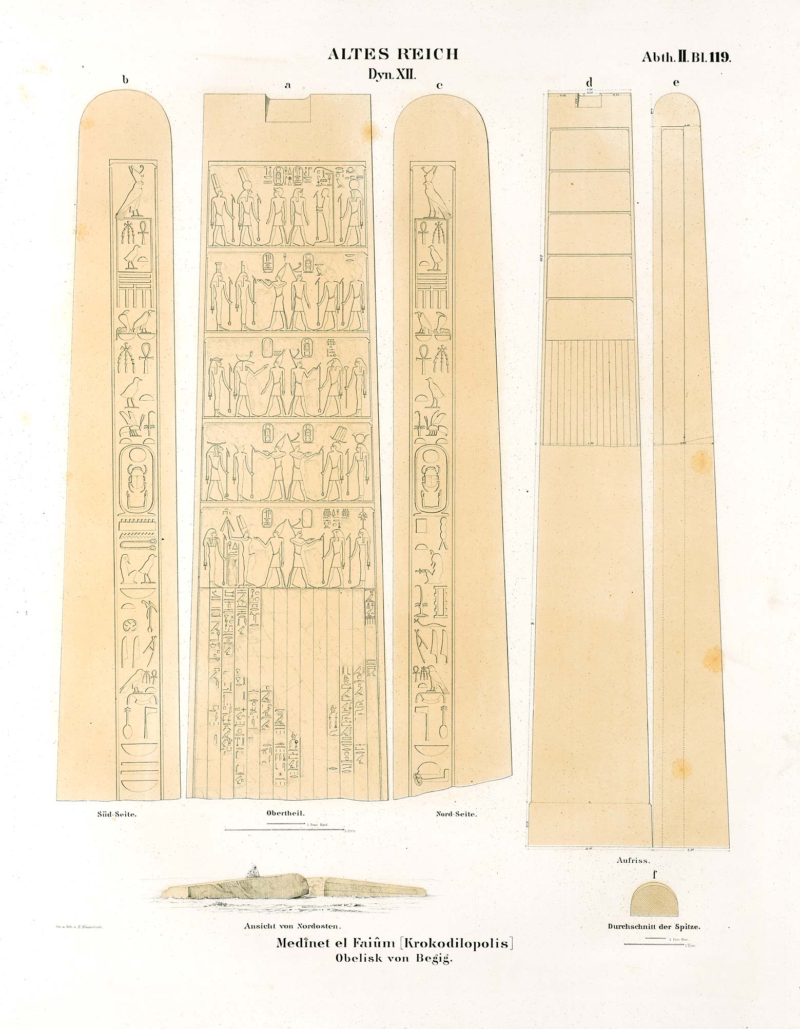 Found toppled and broken in two in a field near the ruins of ancient Crocodilopolis by Napoleon's expedition in 1798. The obelisk is erected in the middle of a roundabout in the city of Faiyum. The inscriptions are in very poor shape, only faint traces remain today, and the bottom is cluttered with modern arabic grafitto. It is only thanks to early Egyptologists that the contents of the inscriptions are preserved. Its shape is unique, it is more like a tall slender stela than an obelisk, with no pyramidion but rather a rounded top.