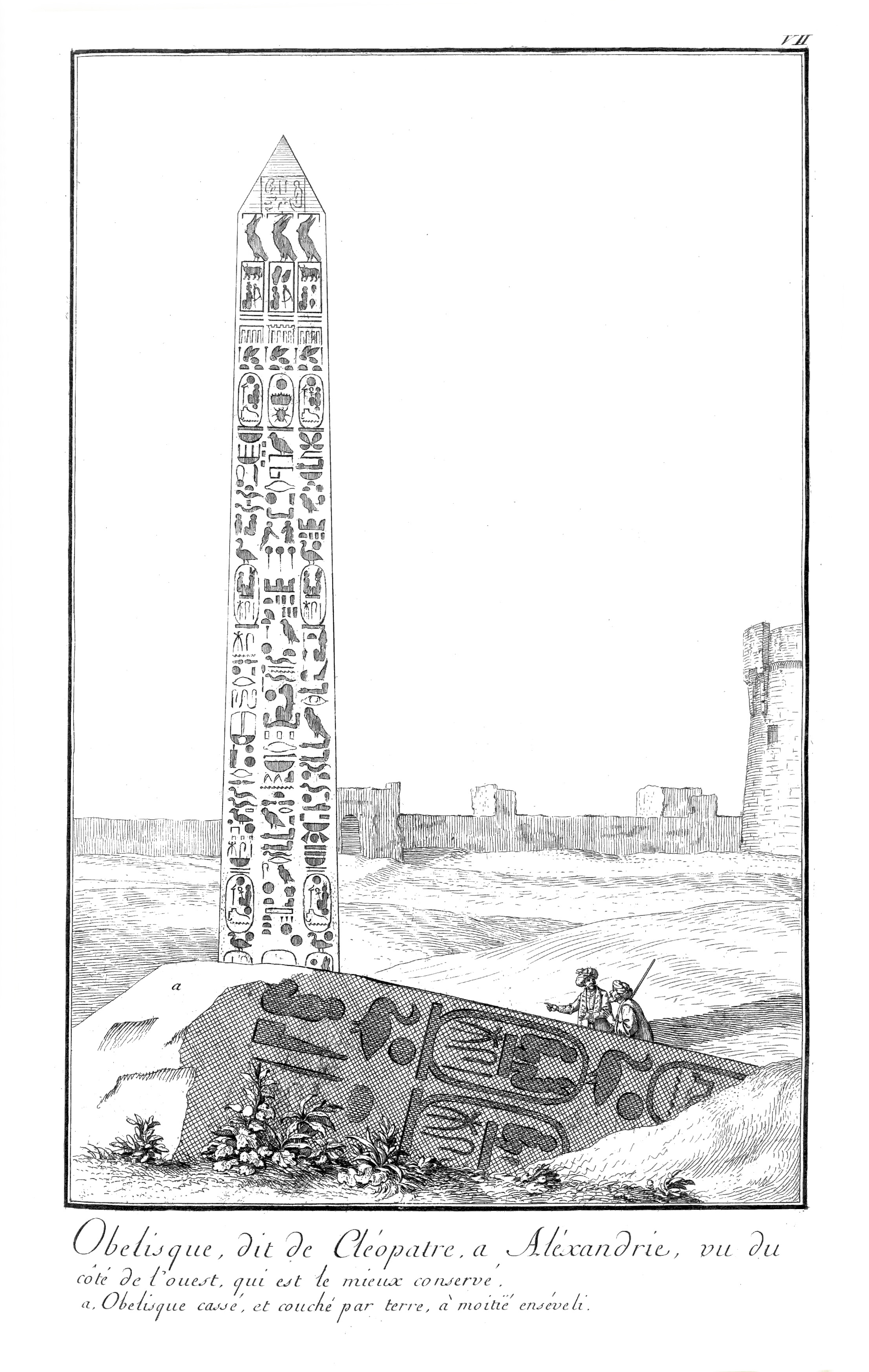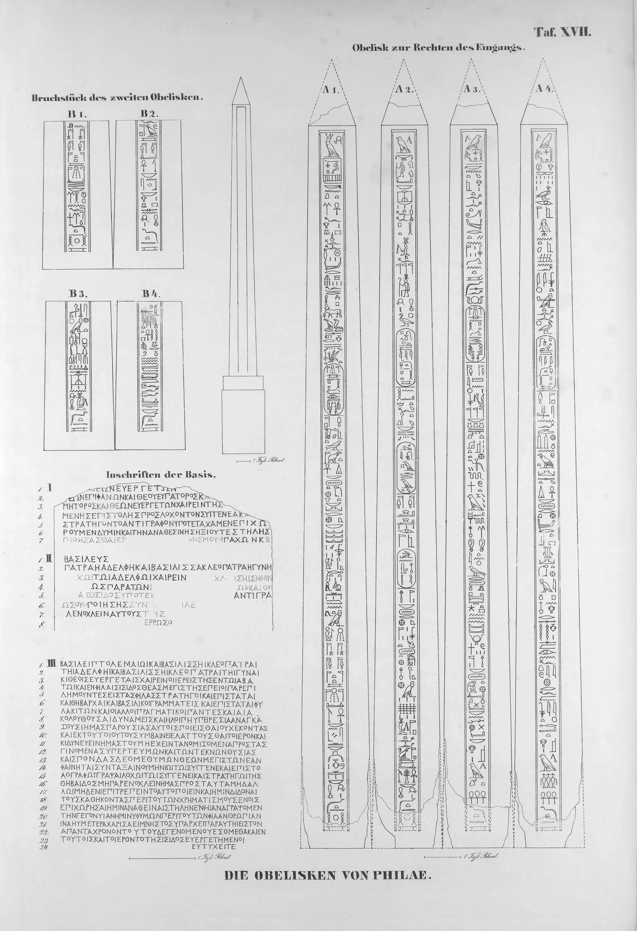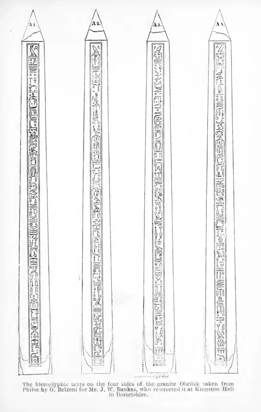 The pair of obelisks, originally from the temple of Isis at Philae, were discovered in 1815 by J. W. Bankes. One is intact, while the other is broken. They arrived at his estate in Dorset in 1821 and remain there today. The sides of the obelisks display a hieroglyphic text, while the base bears a Greek text. While the texts are not identical, they depict the same subject matter.