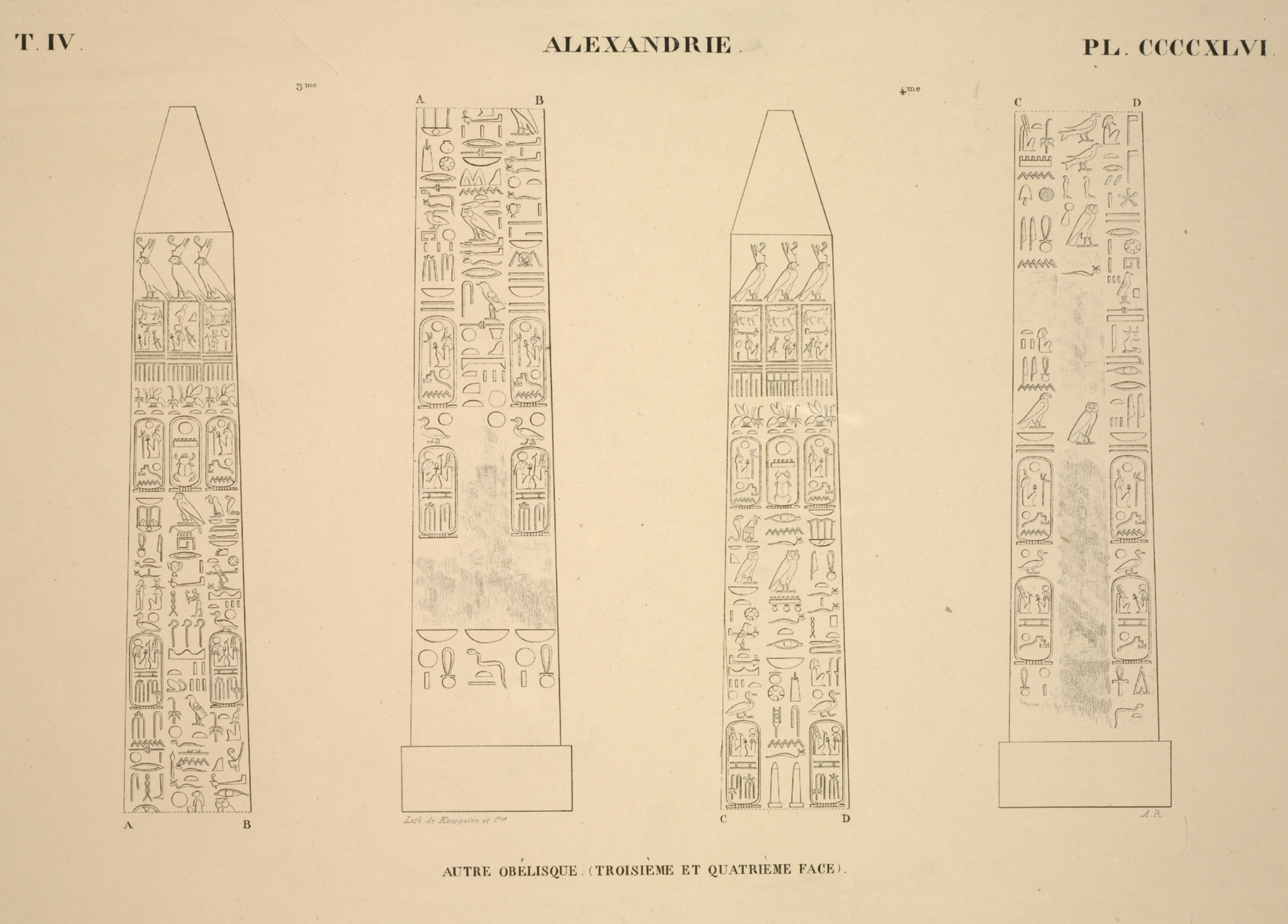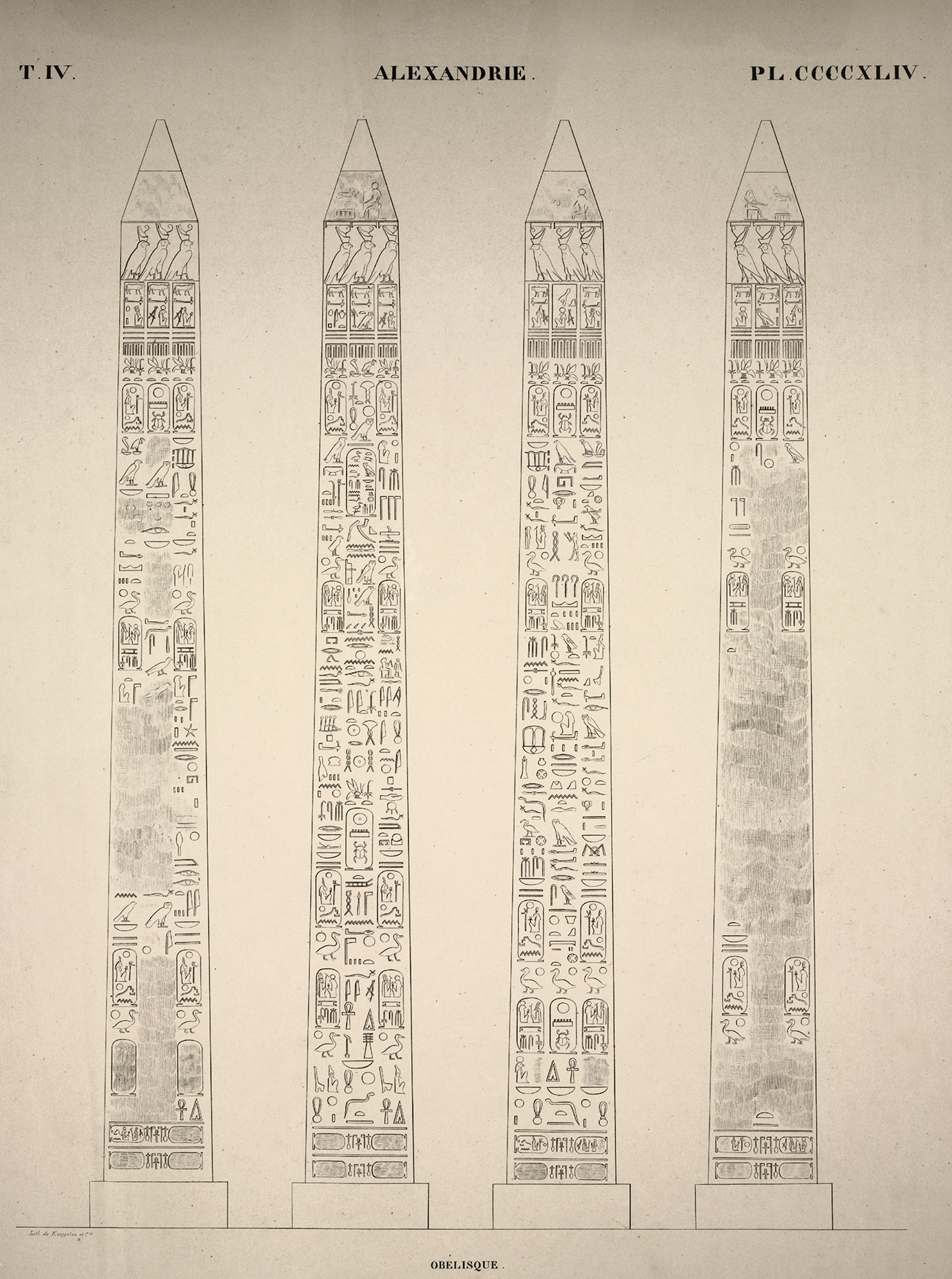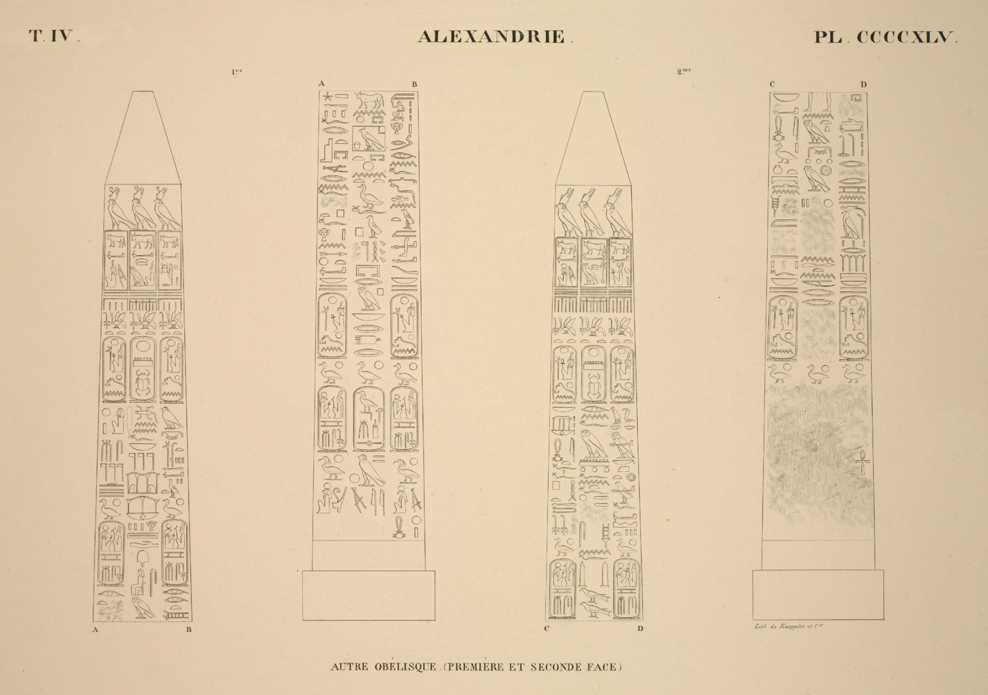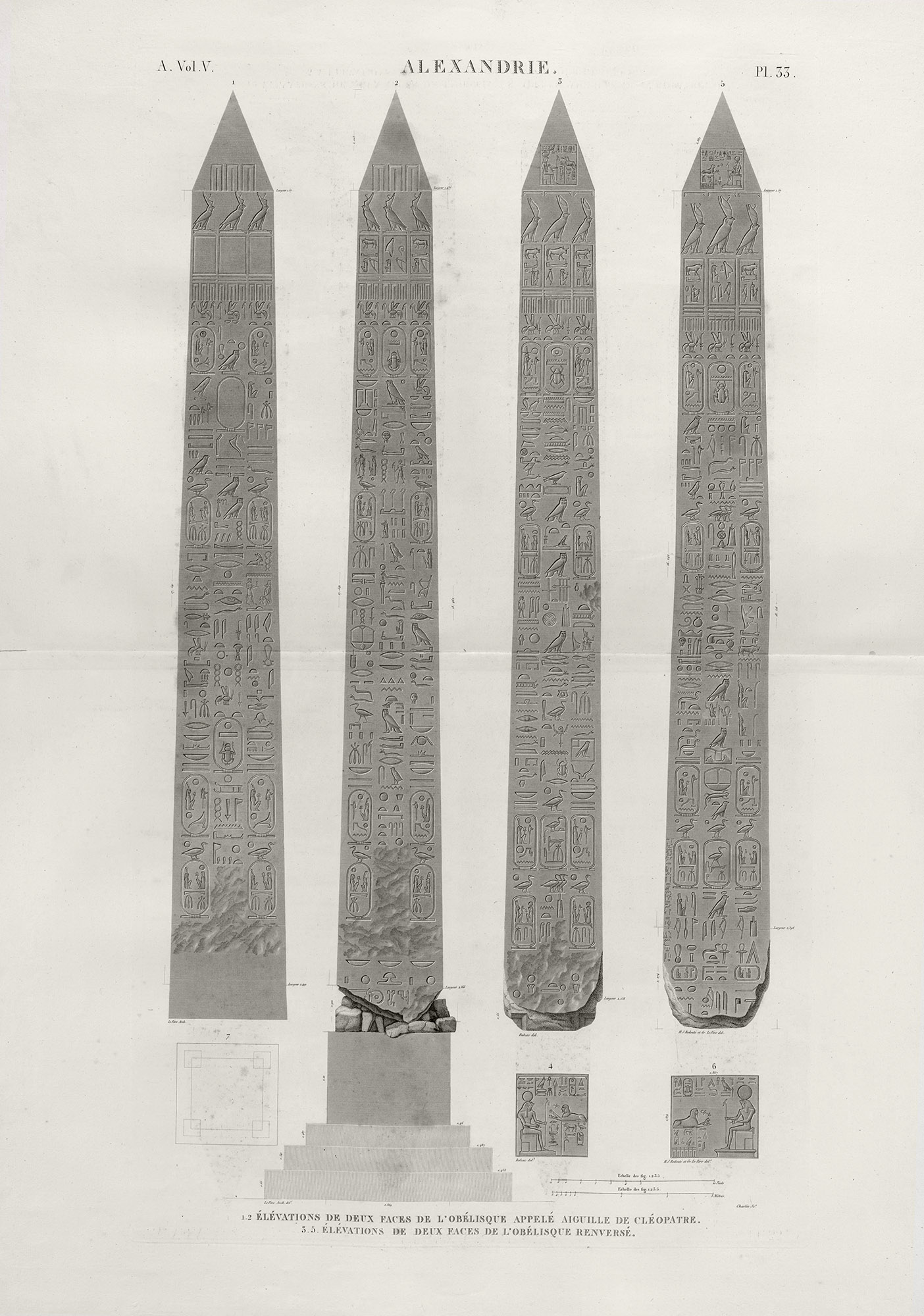 The pair of obelisks, originally from the temple of Isis at Philae, were discovered in 1815 by J. W. Bankes. One is intact, while the other is broken. They arrived at his estate in Dorset in 1821 and remain there today. The sides of the obelisks display a hieroglyphic text, while the base bears a Greek text. While the texts are not identical, they depict the same subject matter.