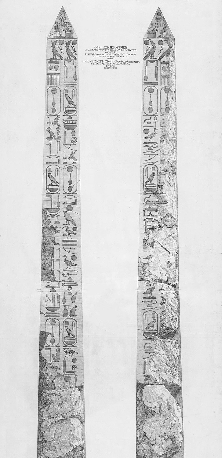 Originally from Heliopolis, it was commissioned by Seti I but only completed and erected by his son, Ramesses II. The hieroglyphs of Merenptah, son of Ramesses II, are also present at the bottom. Emperor Augustus had it brought to Rome together with the Solare obelisk in 10 BC, which is not its mate.
