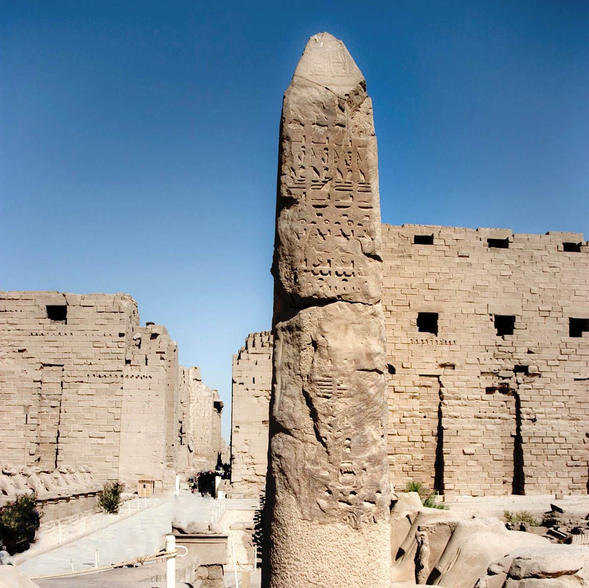 The remains of the southern obselisk stand by the row of sphinxes at the quay of the Great Temple of Amun at Karnak. Only the pedestal of its (north) mate remains.