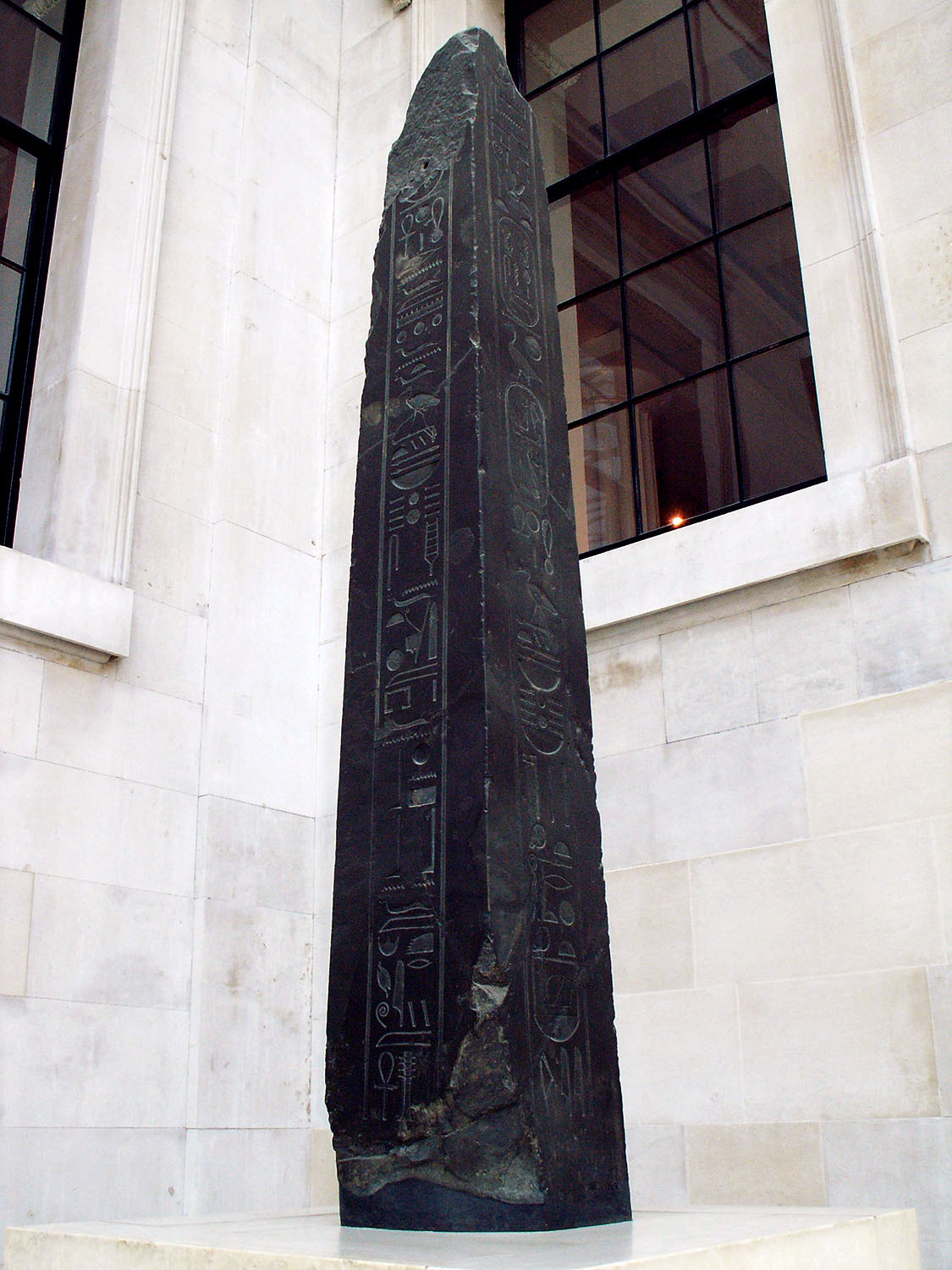 Erected in Heliopolis by Thutmose III around 1450 BC. Some 200 years later, Ramesses II added two columns of inscriptions on either side of the original inscription. The Romans relocated it to Alexandria in 12 BC, along with its twin. Over the following centuries, it gradually became partially buried after toppling. This helped preserve the hieroglyphs from weathering. The misnomer 'Cleopatra's Needle' originates from the French nickname it acquired in Alexandria. It was gifted to Britain in 1819, but remained in Alexandria for almost 60 years. Finally, in 1877, it was transported to London and erected on the Victoria Embankment the following year. Unfortunately, the English weather has not been kind to the hieroglyphs, which have faded significantly.