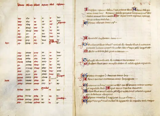 The second volume, the Chronological Canons, revolutionised the study of history. Using the relatively new codex medium, Eusebius divided up the two-page spread of the facing pages in vertical columns. He labeled the leftmost section ‘Kings of …’ (whichever empire was in power at the time), and the rightmost section ‘Kings of the Egyptians’. When new powers arose, he added an extra column to accommodate them; when they disappeared, the column vanished as well. When a king took the throne, his name was recorded on a separate line, and then listed each year of his reign on successive lines with enough space for additional information if needed.